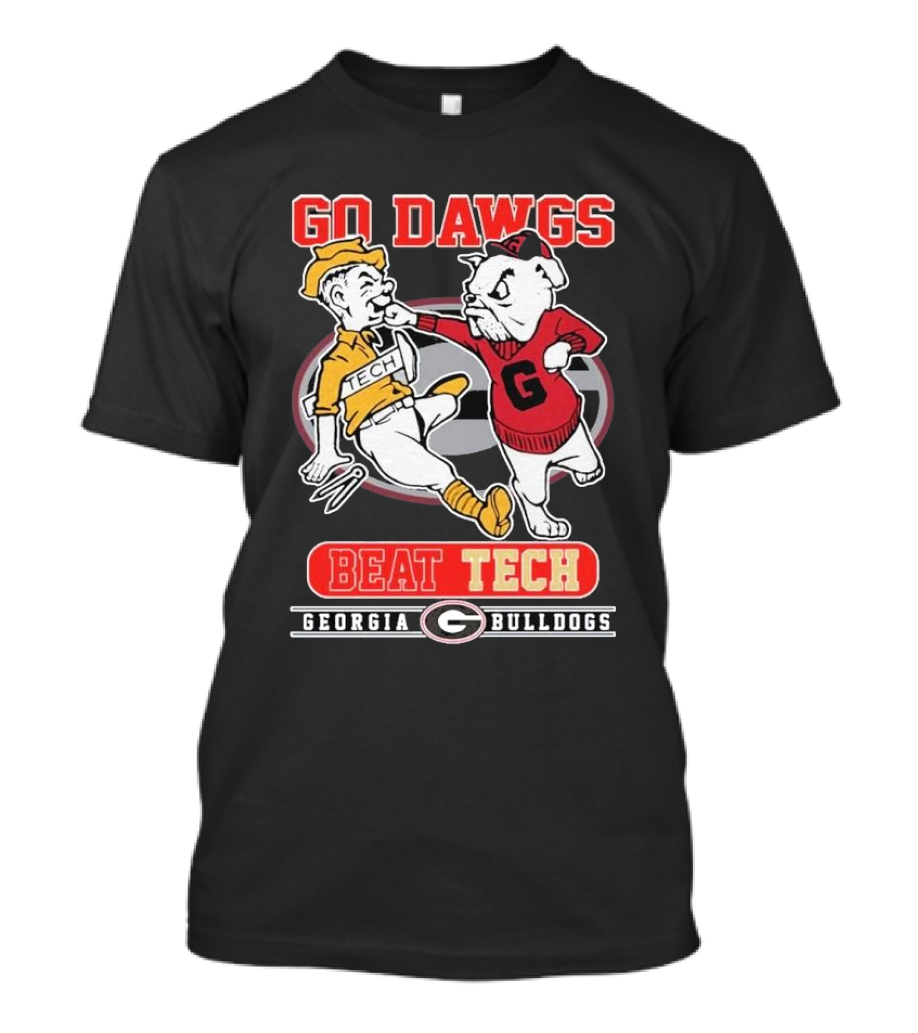 The Go Dawgs Beat Tech Georgia Bulldogs Rivalry Football Mascot Showdown T-shirt is designed for everyday wear and a consistent fit. Fabric is pre-shrunk ring-spun cotton with durable stitching. See the size chart below for exact measurements.
