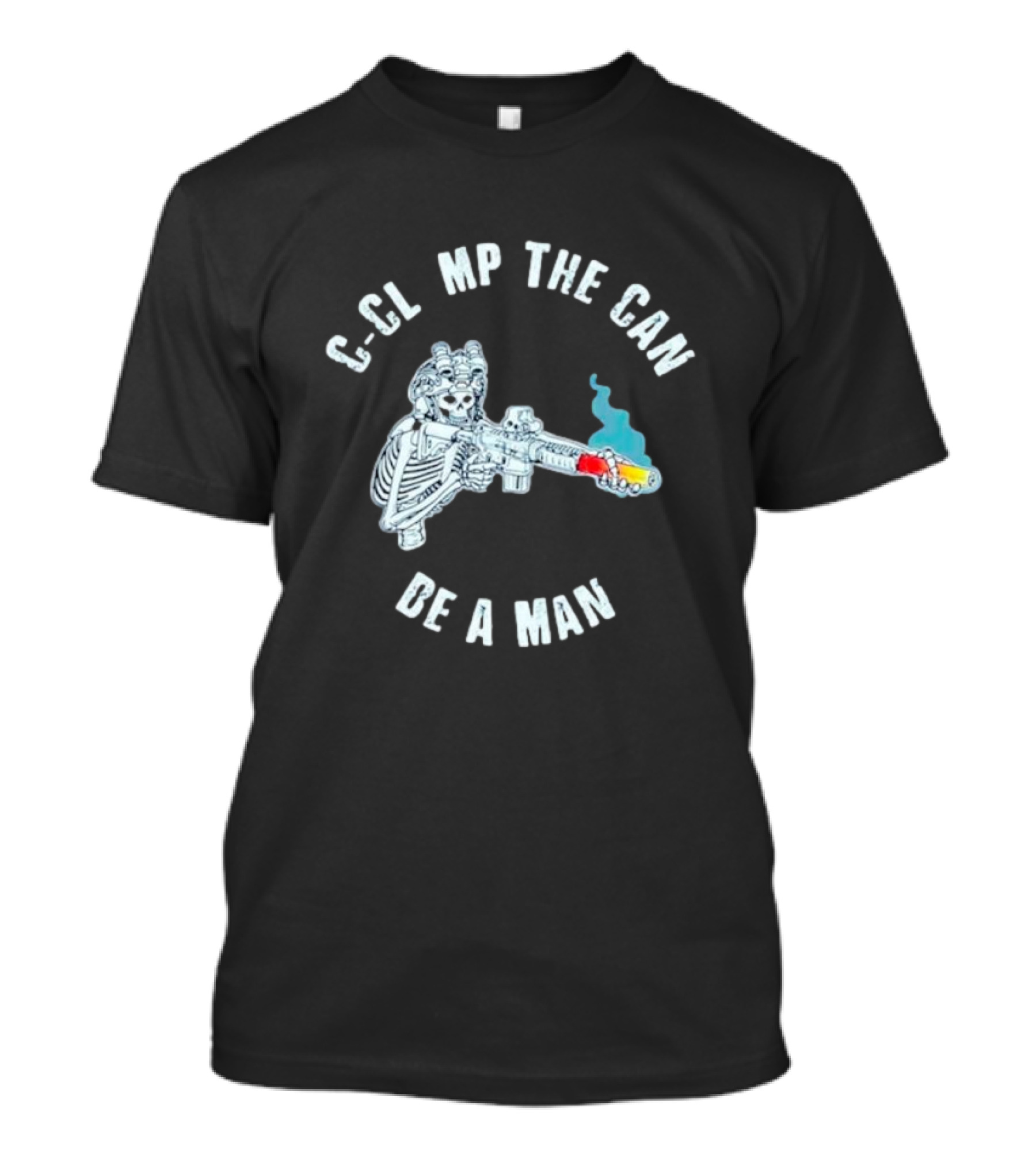 Skeleton Holding C-Clamp Blaster Be A Man T-Shirt
