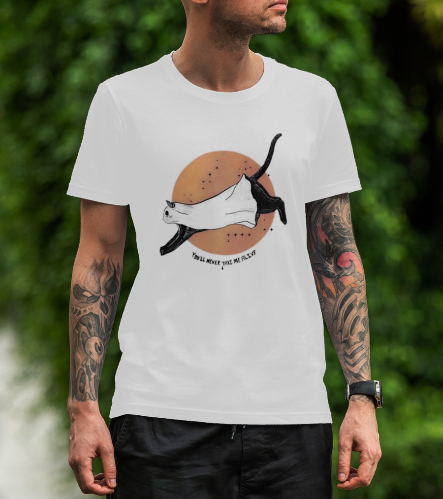 The You'Ll Never Take Me Alive Black Cat Halloween Moon Escape T-shirt is designed for everyday wear and a consistent fit. Fabric is pre-shrunk ring-spun cotton with durable stitching. See the size chart below for exact measurements.