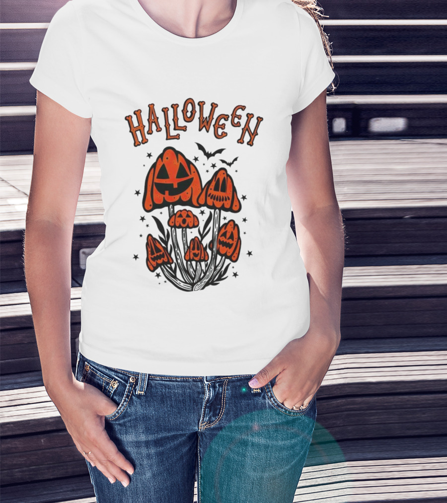 Halloween Pumpkin Mushrooms With Bats And Stars T-Shirt