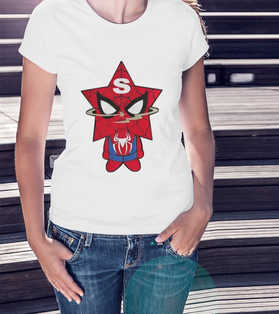 The Star Character with Superhero Web Icon and Red Suit T-shirt is designed for everyday wear and a consistent fit. Fabric is pre-shrunk ring-spun cotton with durable stitching. See the size chart below for exact measurements.