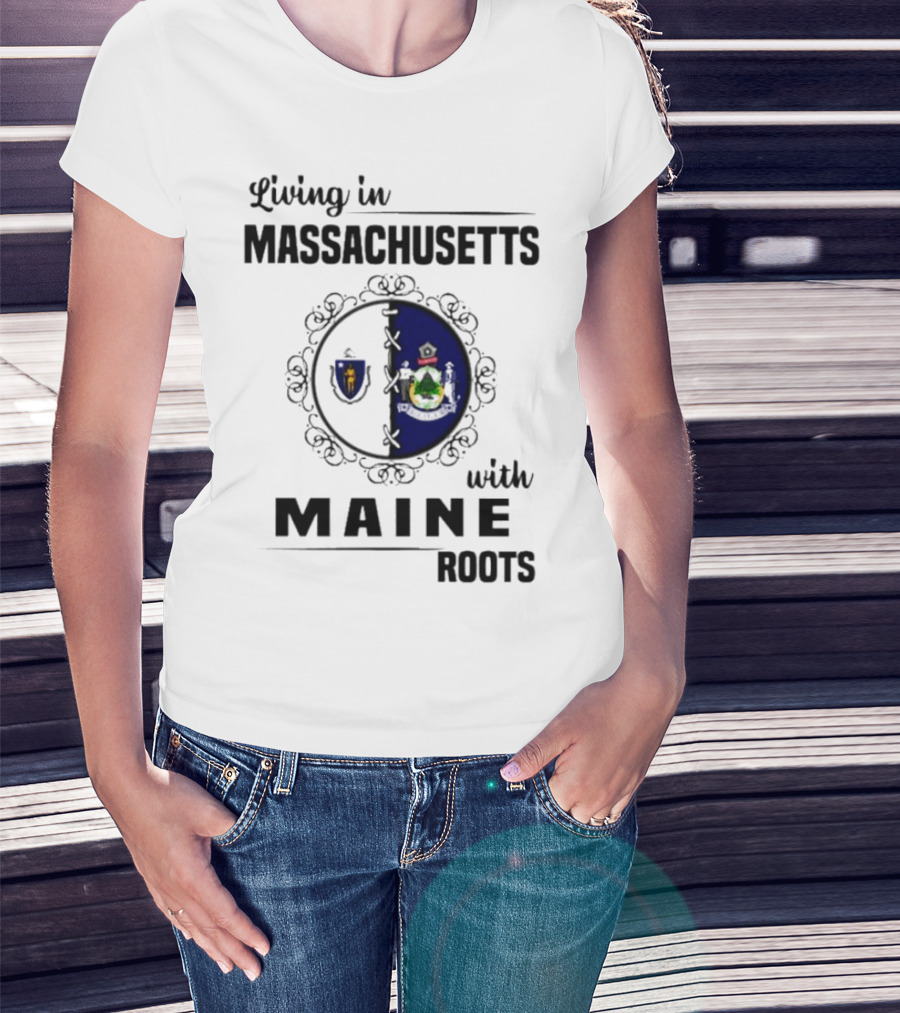 Living In Massachusetts With Maine Roots Featuring State Flags Emblem T-Shirt