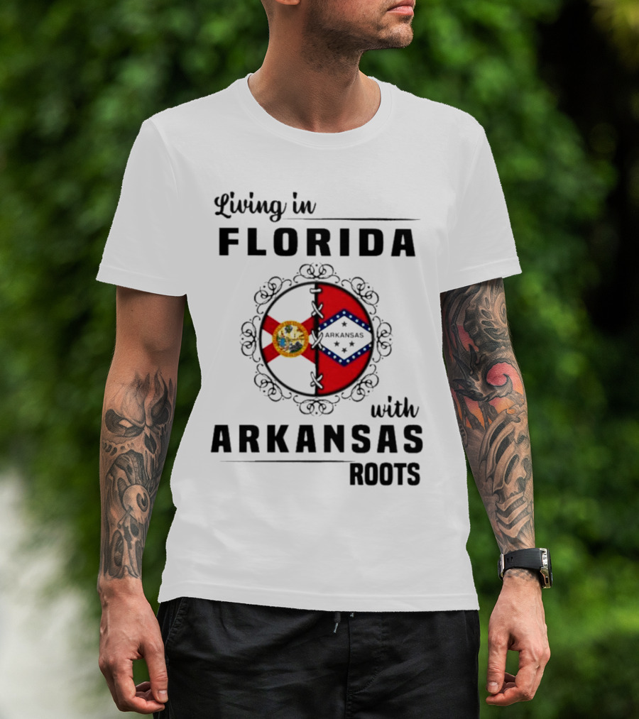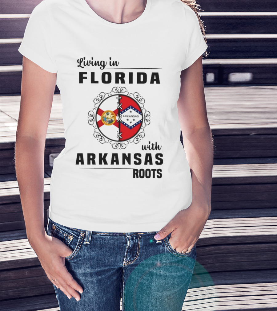 Living In Florida With Arkansas Roots Emblem Featuring State Seals And Flags T-Shirt