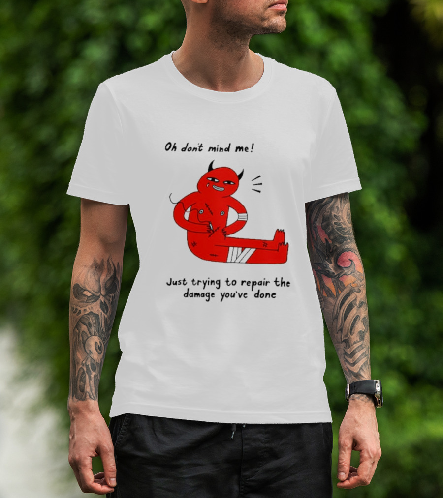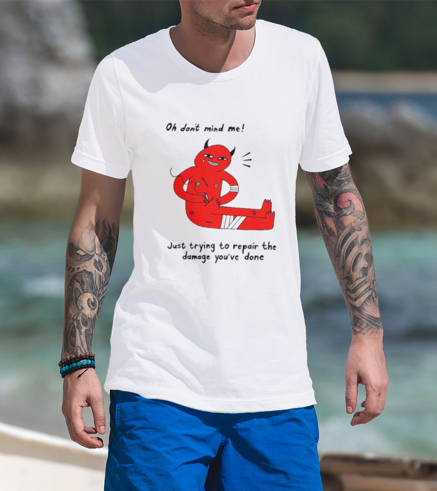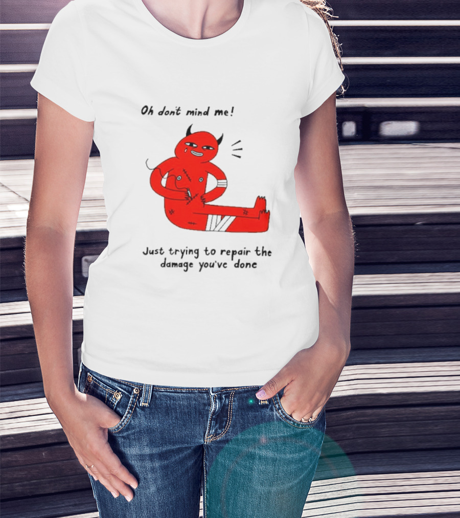 Oh Don’t Mind Me Just Trying To Repair The Damage You’ve Done Red Cartoon Devil Patching Up T-Shirt