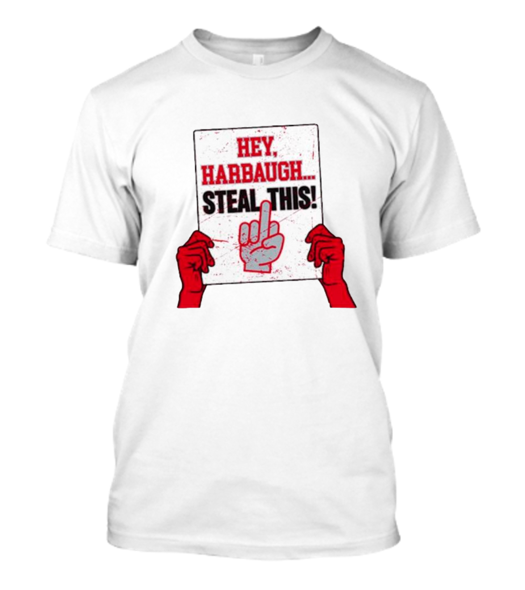 The Ohio State Buckeyes Hey Harbaugh Steal This Middle Finger Gesture T-shirt is designed for everyday wear and a consistent fit. Fabric is pre-shrunk ring-spun cotton with durable stitching. See the size chart below for exact measurements.