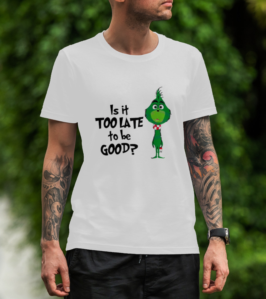 Is It Too Late To Be Good Funny Grinchmas Green Character T-Shirt
