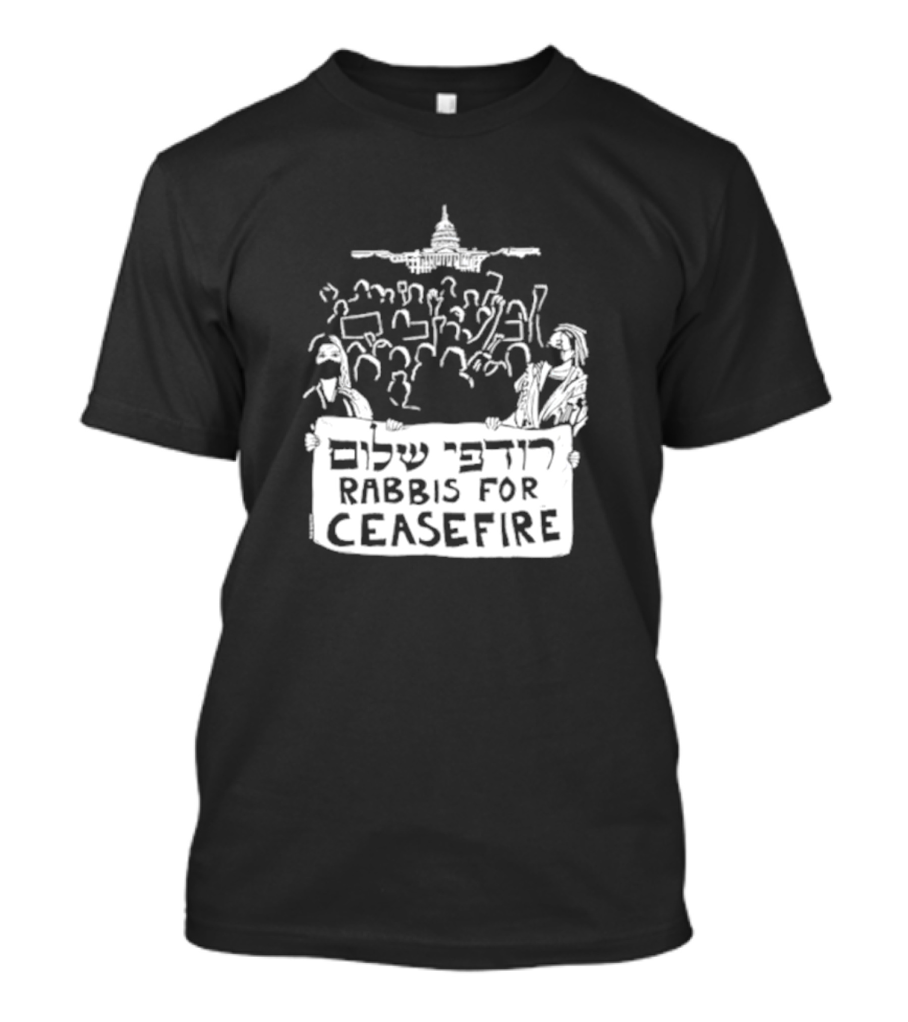 The Rabbis for Ceasefire Rally at Capitol with Protesters and Hebrew Text T-shirt is designed for everyday wear and a consistent fit. Fabric is pre-shrunk ring-spun cotton with durable stitching. See the size chart below for exact measurements.