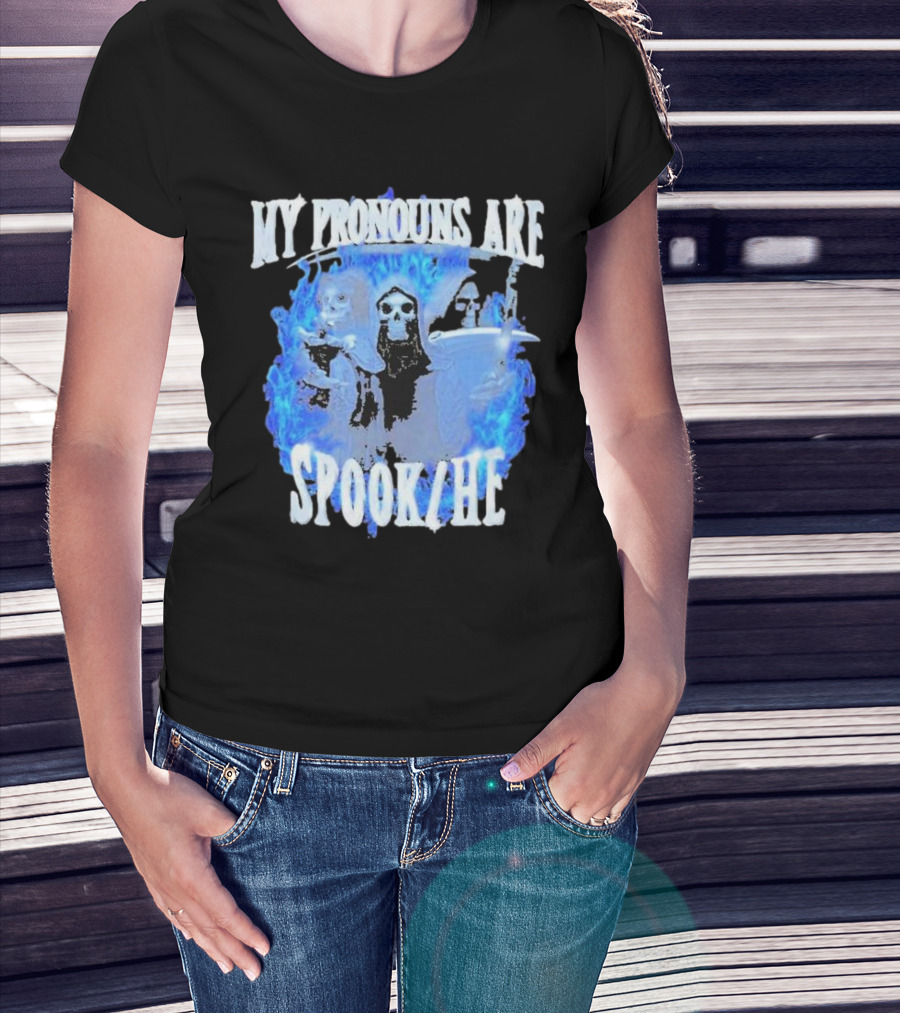 My Pronouns Are Spook He Blue Flames Grim Reaper Trio T-Shirt