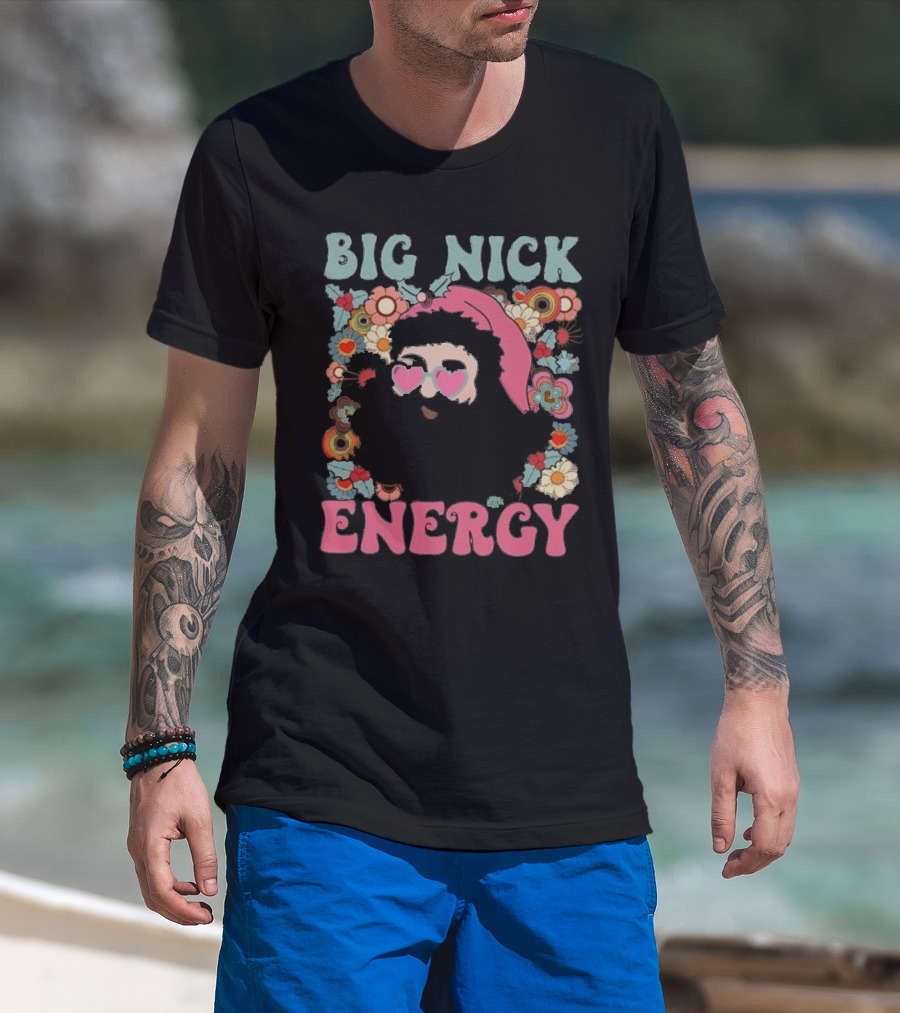 The Big Nick Energy Merry Christmas Party Funny Santa with Flowers and Heart Sunglasses T-shirt is designed for everyday wear and a consistent fit. Fabric is pre-shrunk ring-spun cotton with durable stitching. See the size chart below for exact measurements.