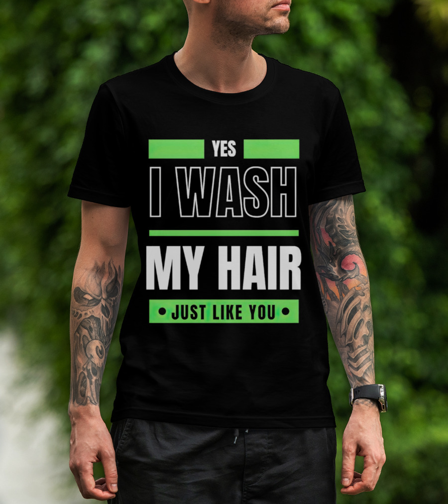 The Yes I Wash My Hair Just Like You T-shirt is designed for everyday wear and a consistent fit. Fabric is pre-shrunk ring-spun cotton with durable stitching. See the size chart below for exact measurements.