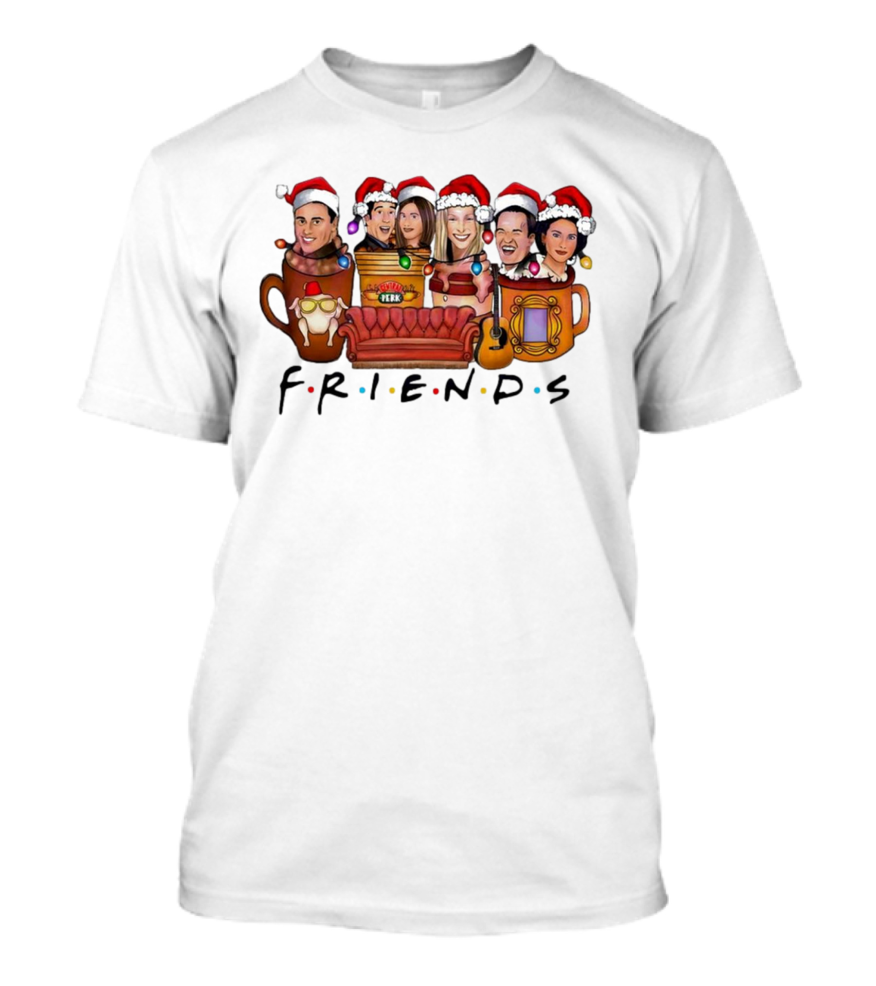 The Friends TV Show Christmas Central Perk Couch and Santa Hats T-shirt is designed for everyday wear and a consistent fit. Fabric is pre-shrunk ring-spun cotton with durable stitching. See the size chart below for exact measurements.