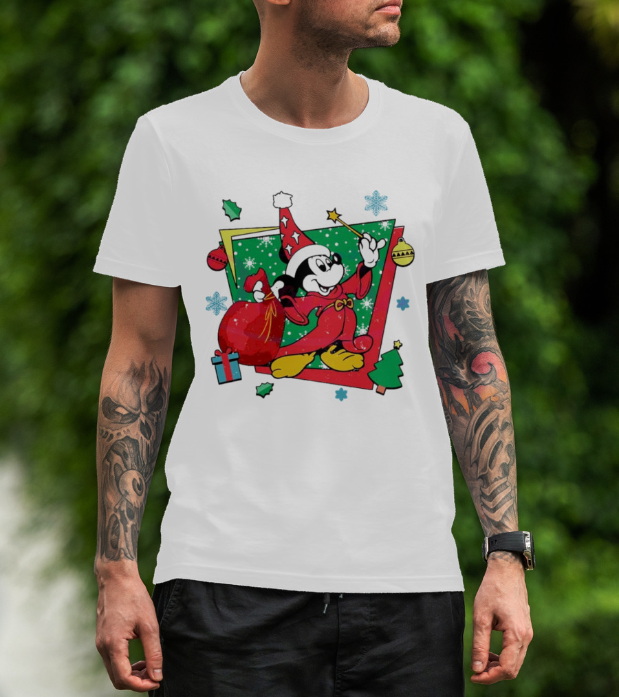 The Mickey Sorcerers Apprentice Christmas 90s Magic Holiday T-shirt is designed for everyday wear and a consistent fit. Fabric is pre-shrunk ring-spun cotton with durable stitching. See the size chart below for exact measurements.