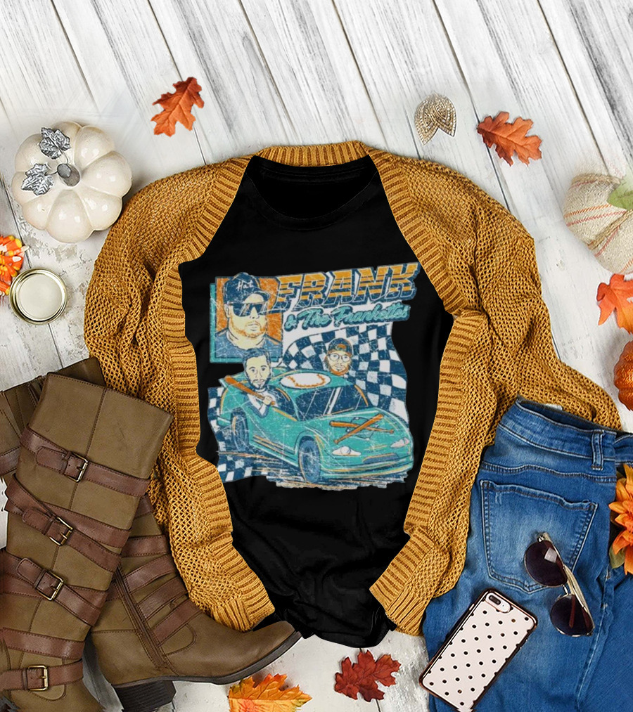 Frank And The Frankettes Racing Car Adventure With Checkered Flags And Cartoon Characters T-Shirt