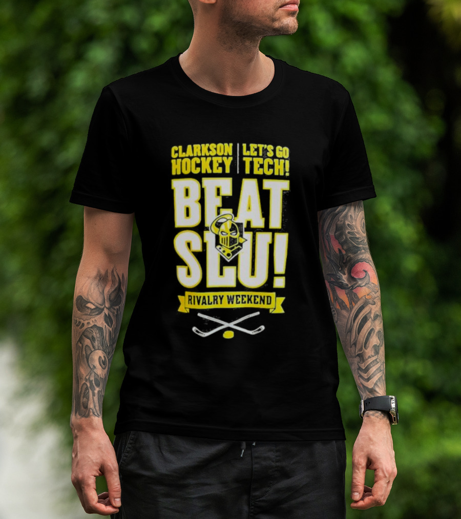 Clarkson Hockey Let's Go Tech Beat SLU Rivalry Weekend Hockey Sticks And Puck T-Shirt