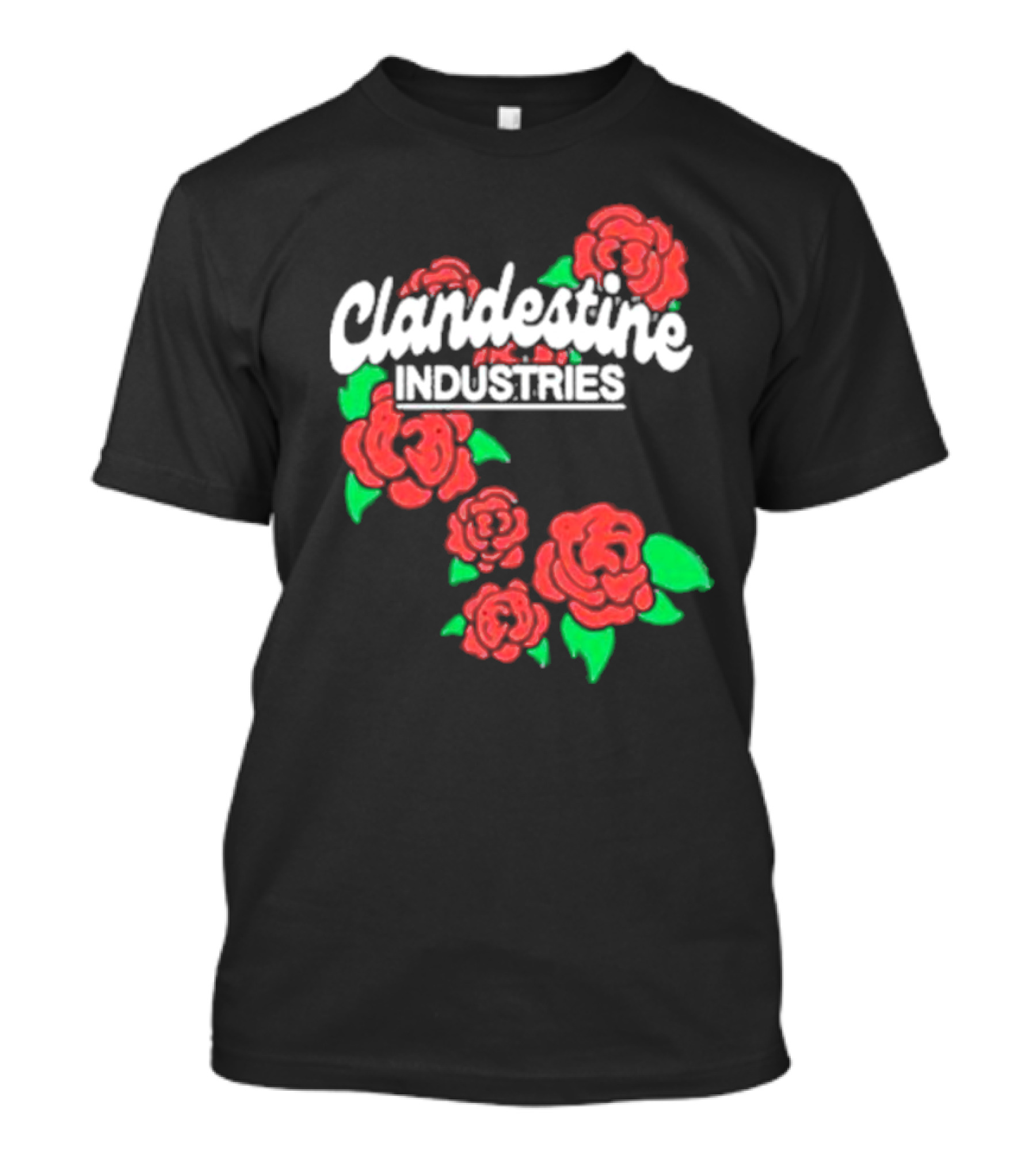 The Clandestine Industries Roses Band with Red and Green Elements T-shirt is designed for everyday wear and a consistent fit. Fabric is pre-shrunk ring-spun cotton with durable stitching. See the size chart below for exact measurements.