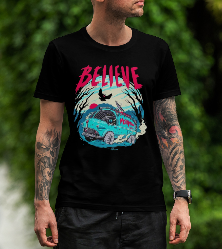 The Believe Mothman Shadow Van Adventure T-shirt is designed for everyday wear and a consistent fit. Fabric is pre-shrunk ring-spun cotton with durable stitching. See the size chart below for exact measurements.