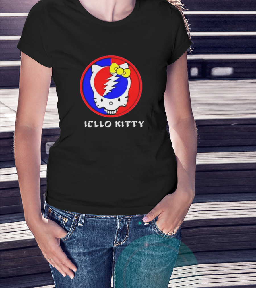 Hello Kitty Grateful Dead Skull Icon With Lightning Bolt And Yellow Bow T-Shirt