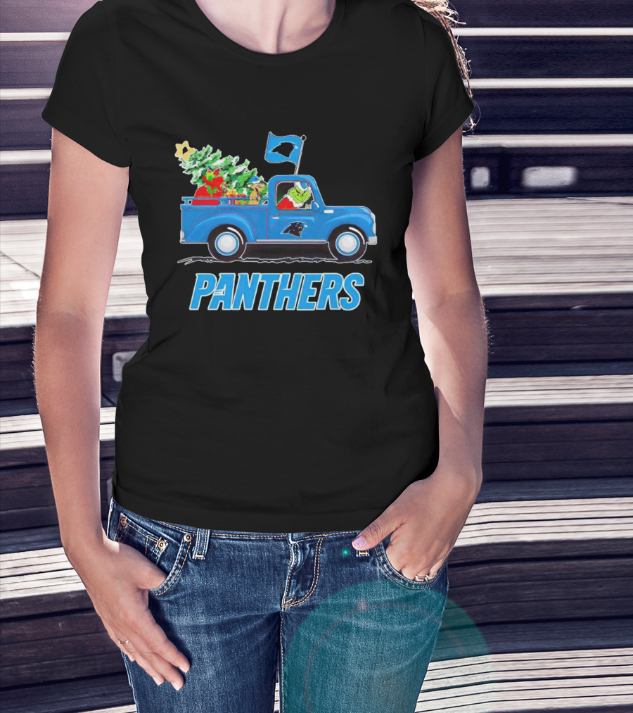 Grinch In Blue Christmas Truck With Carolina Panthers Logo And Tree T-Shirt