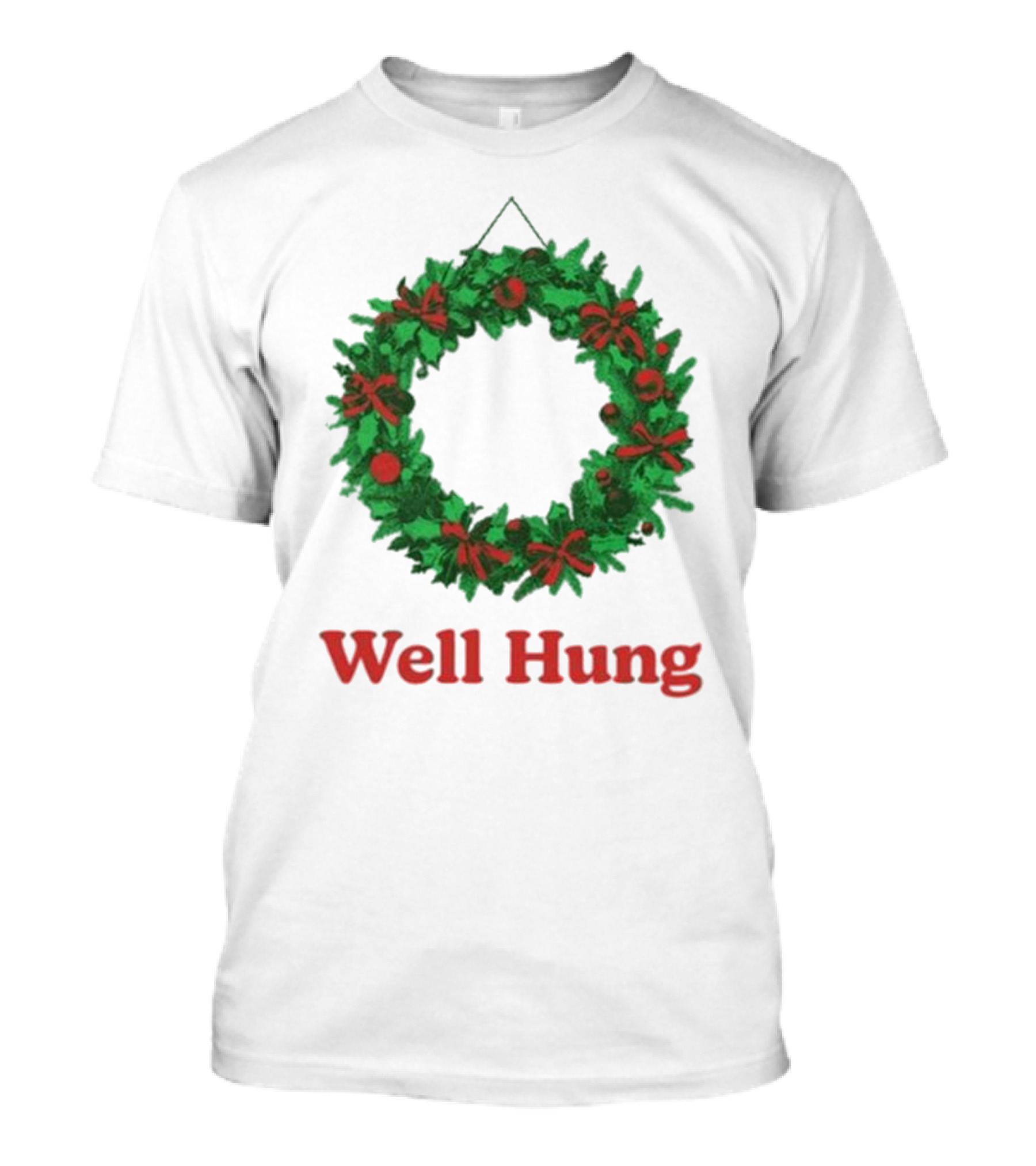 The Middleclassfancy Well Hung Holiday Wreath Christmas T-shirt is designed for everyday wear and a consistent fit. Fabric is pre-shrunk ring-spun cotton with durable stitching. See the size chart below for exact measurements.