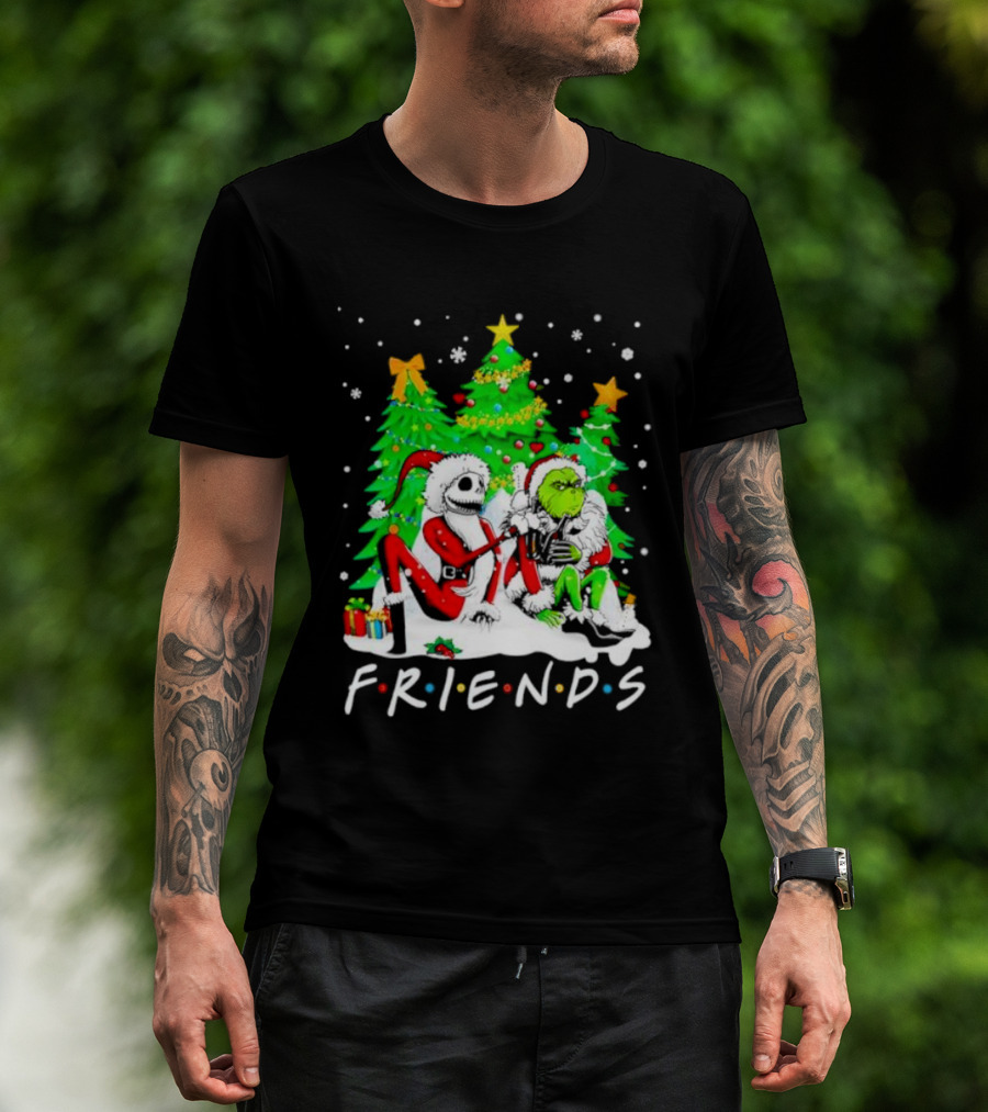 Friends Jack Skellington And Grinch Christmas Scene With Santa Outfits And Christmas Trees T-Shirt