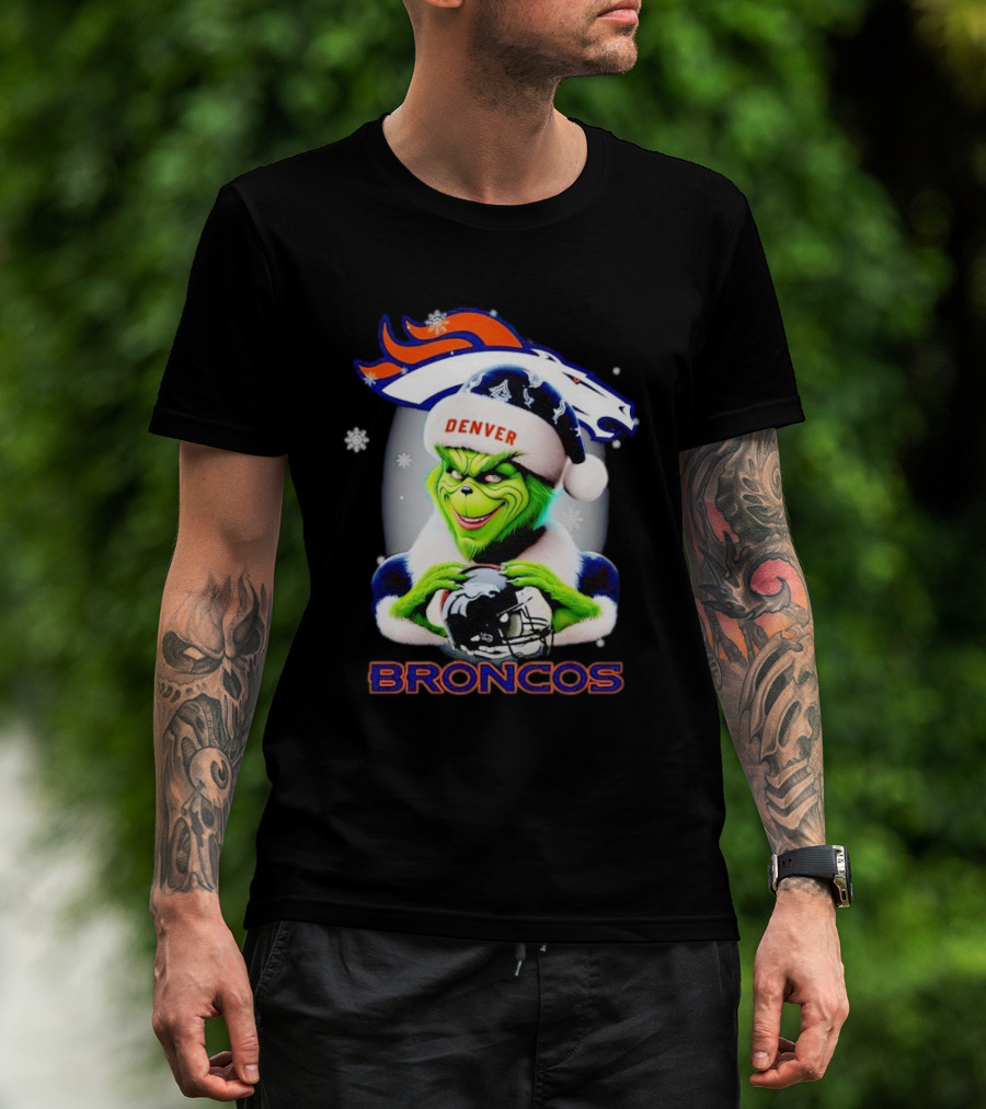 Denver Broncos Christmas Grinch Holding Football Helmet T-Shirt