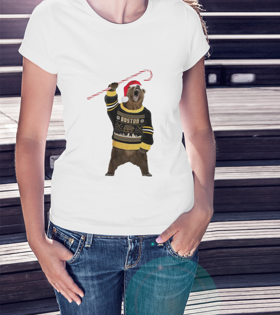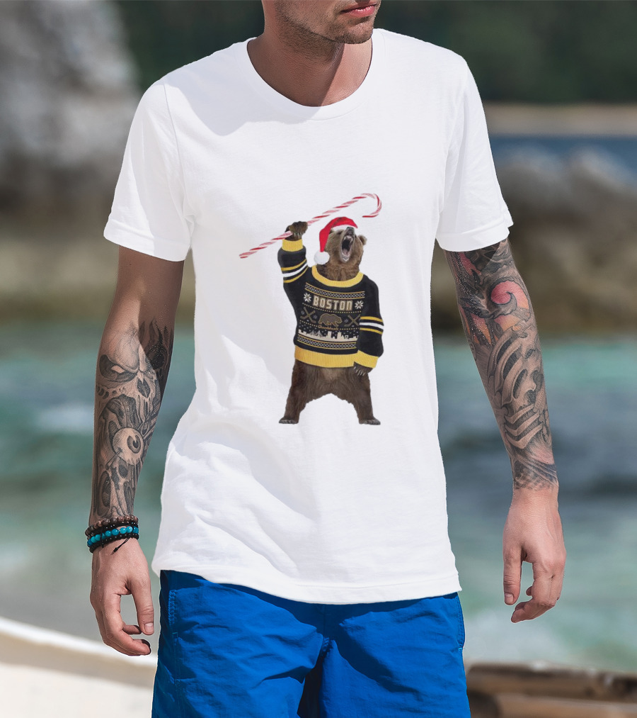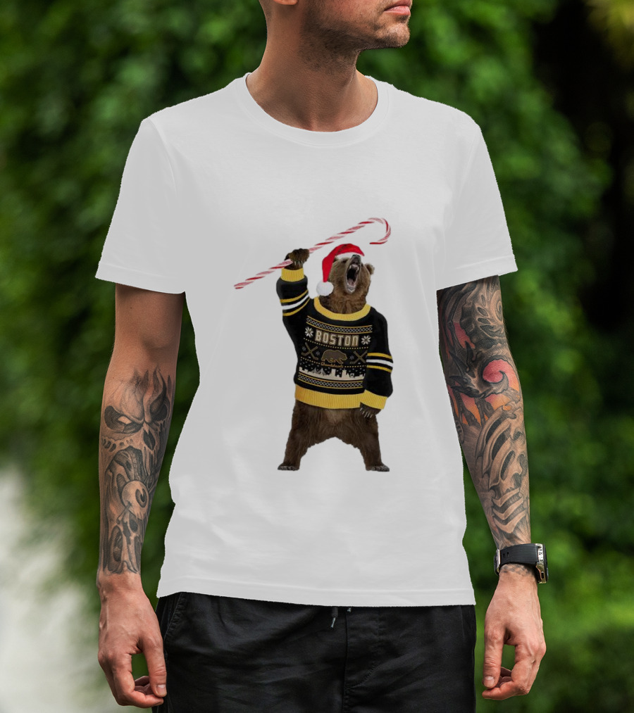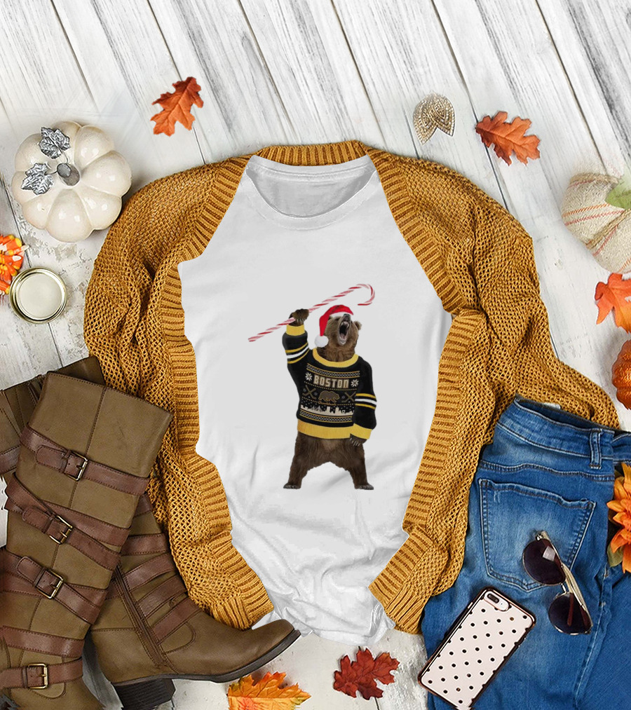 Boston Bear Christmas Holiday Sweater Santa Hat Candy Cane T-Shirt