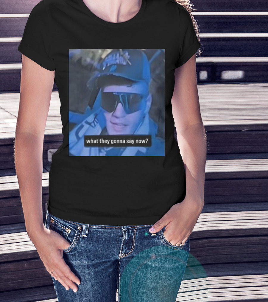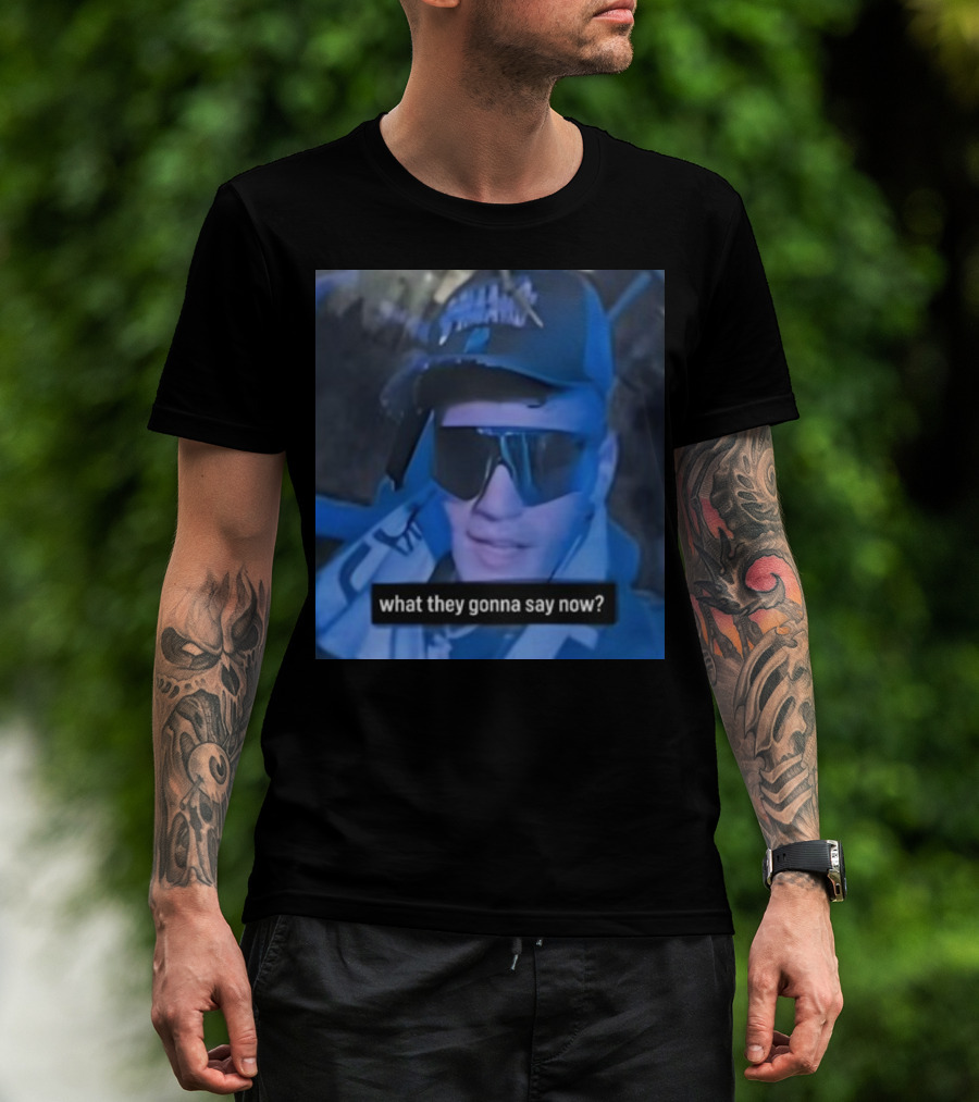 The What They Gonna Say Now - Man in Sunglasses and Cap with Blue Tint T-shirt is designed for everyday wear and a consistent fit. Fabric is pre-shrunk ring-spun cotton with durable stitching. See the size chart below for exact measurements.