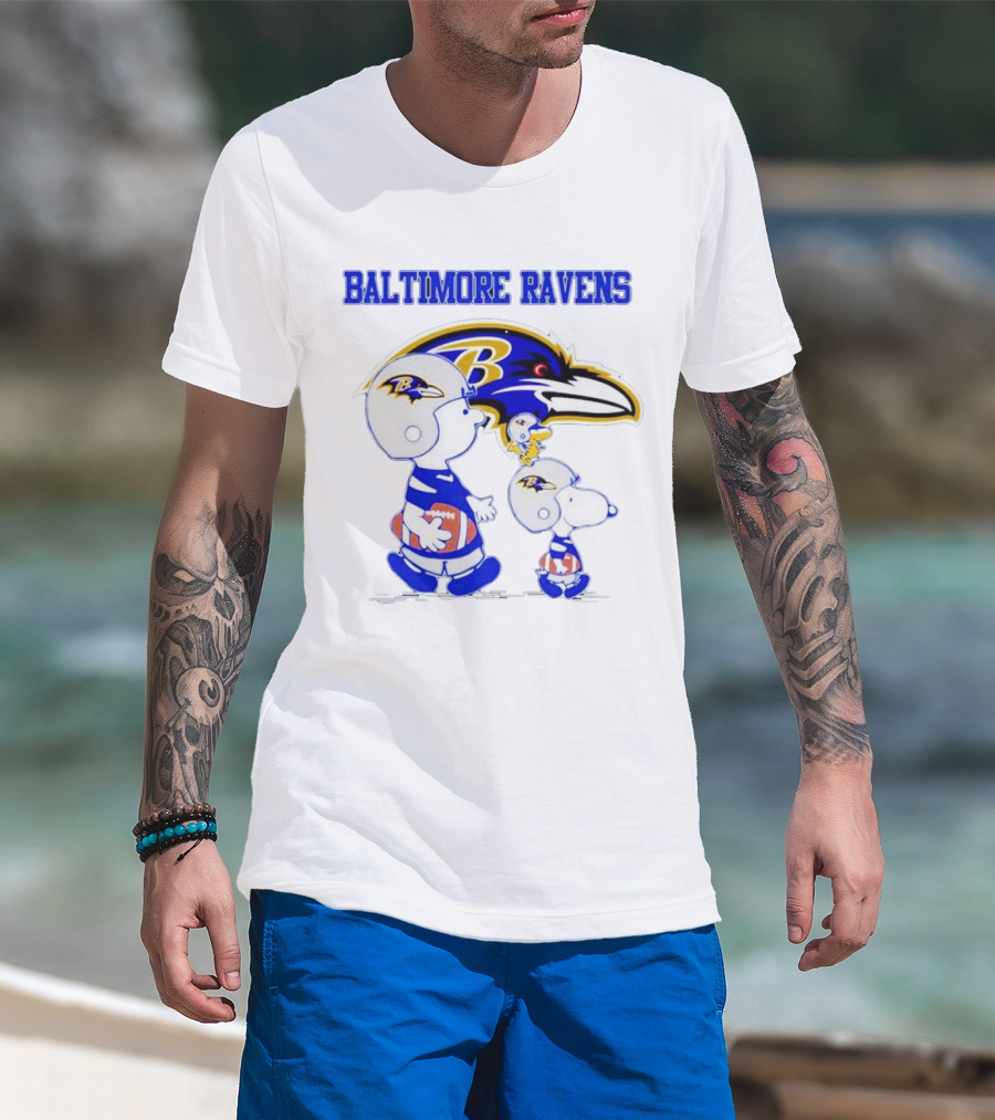 The Baltimore Ravens Peanuts Snoopy and Woodstock Football Ravens T-shirt is designed for everyday wear and a consistent fit. Fabric is pre-shrunk ring-spun cotton with durable stitching. See the size chart below for exact measurements.