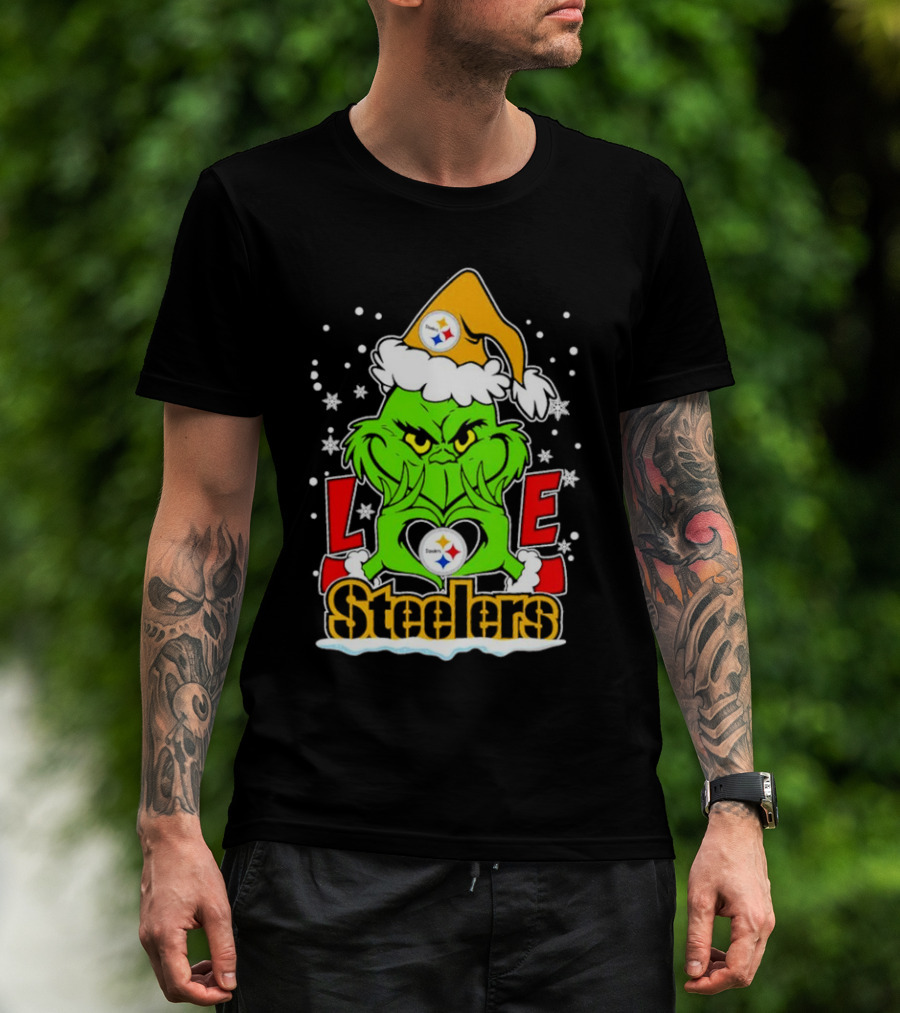 The Grinch Santa Hat Love Pittsburgh Steelers Logo Snowflakes T-Shirt