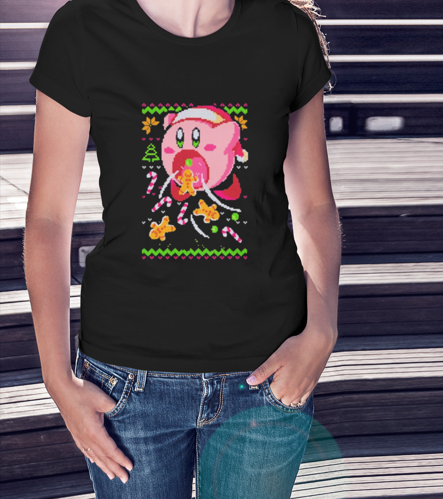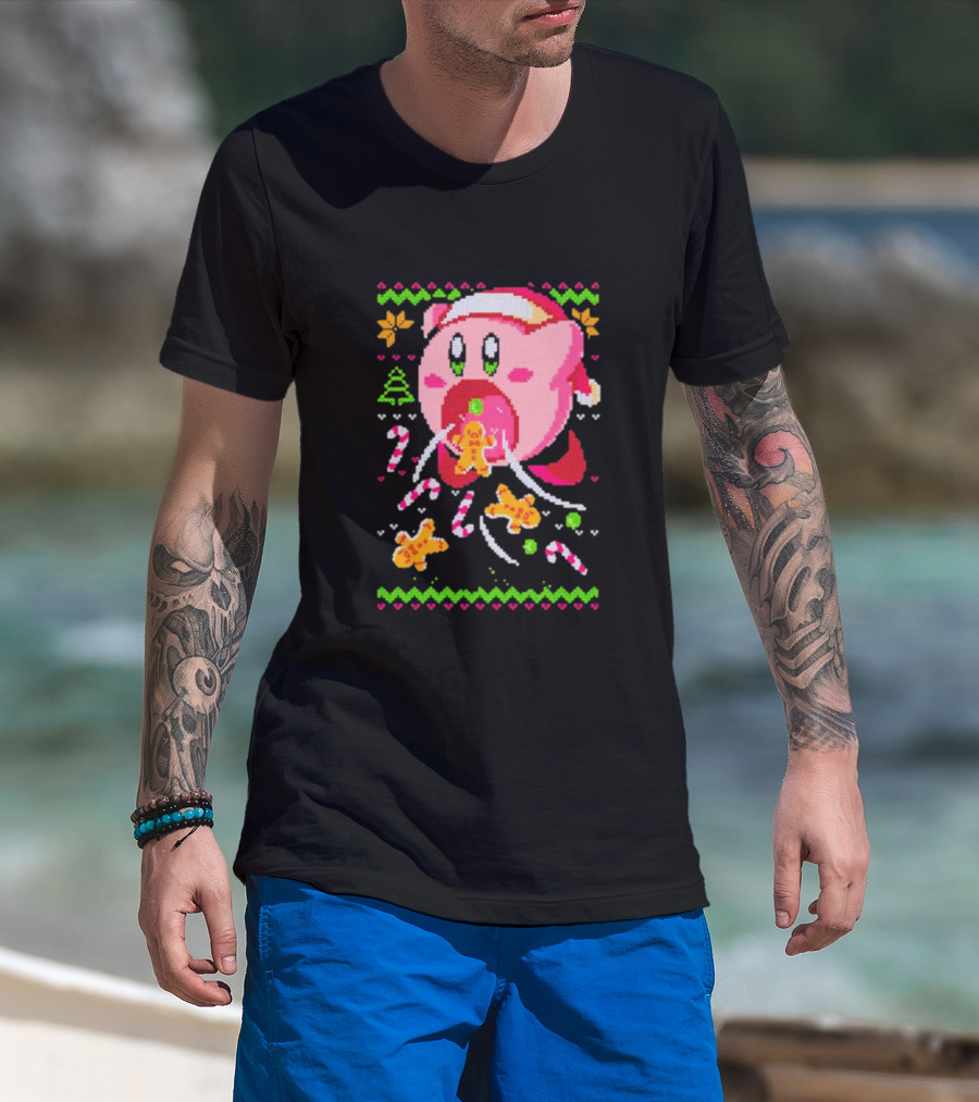 Kirby Santa Hat Eating Gingerbread Candy Canes Holiday T-Shirt