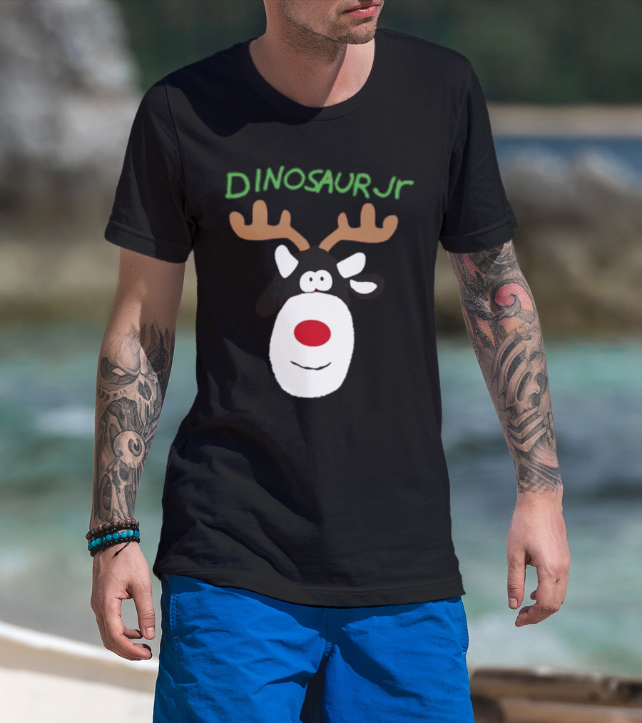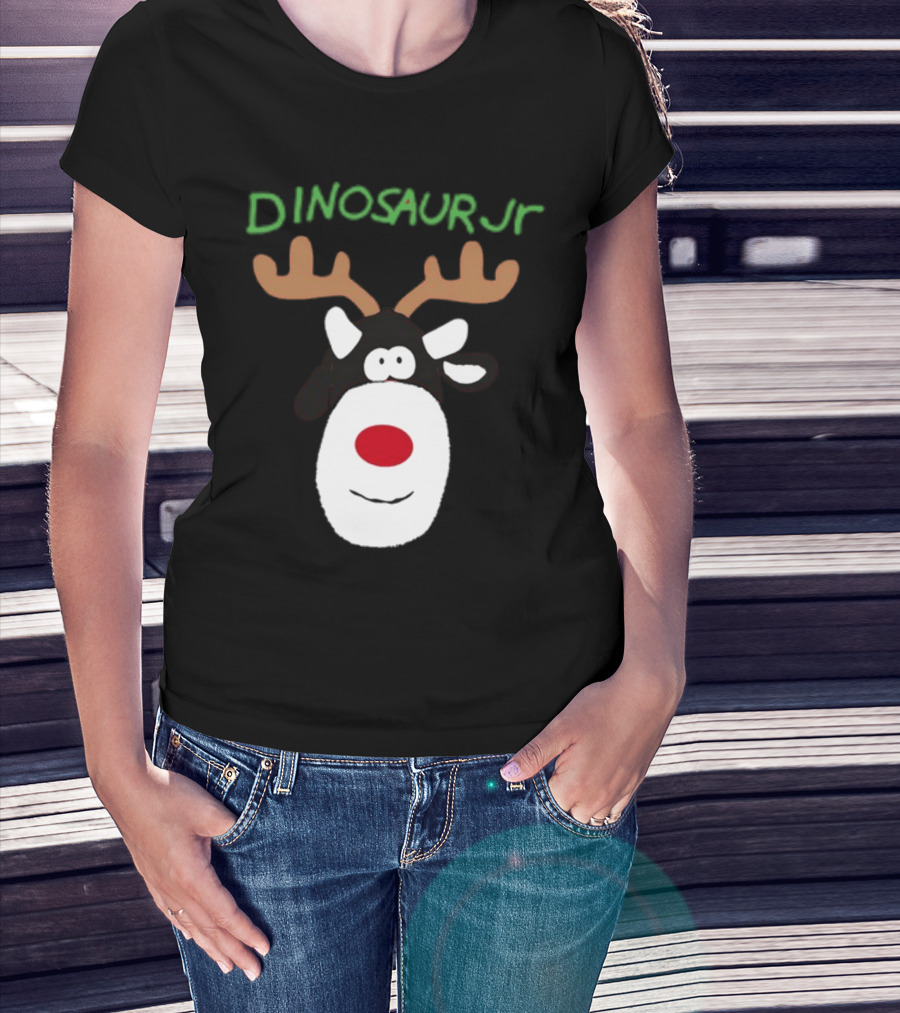 The Dinosaur Jr Reindeer with Red Nose and Antlers T-shirt is designed for everyday wear and a consistent fit. Fabric is pre-shrunk ring-spun cotton with durable stitching. See the size chart below for exact measurements.