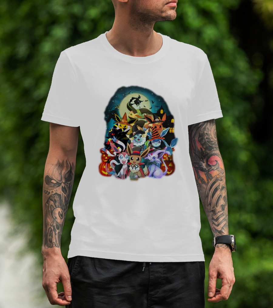 Halloween Eevee All Evolutions With Pumpkins And Witch Hat Moon Scene T-Shirt