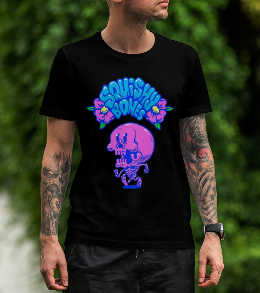 The Danny Gonzalez Squishy Bones Vibrant Skull and Flowers Navy T-shirt is designed for everyday wear and a consistent fit. Fabric is pre-shrunk ring-spun cotton with durable stitching. See the size chart below for exact measurements.