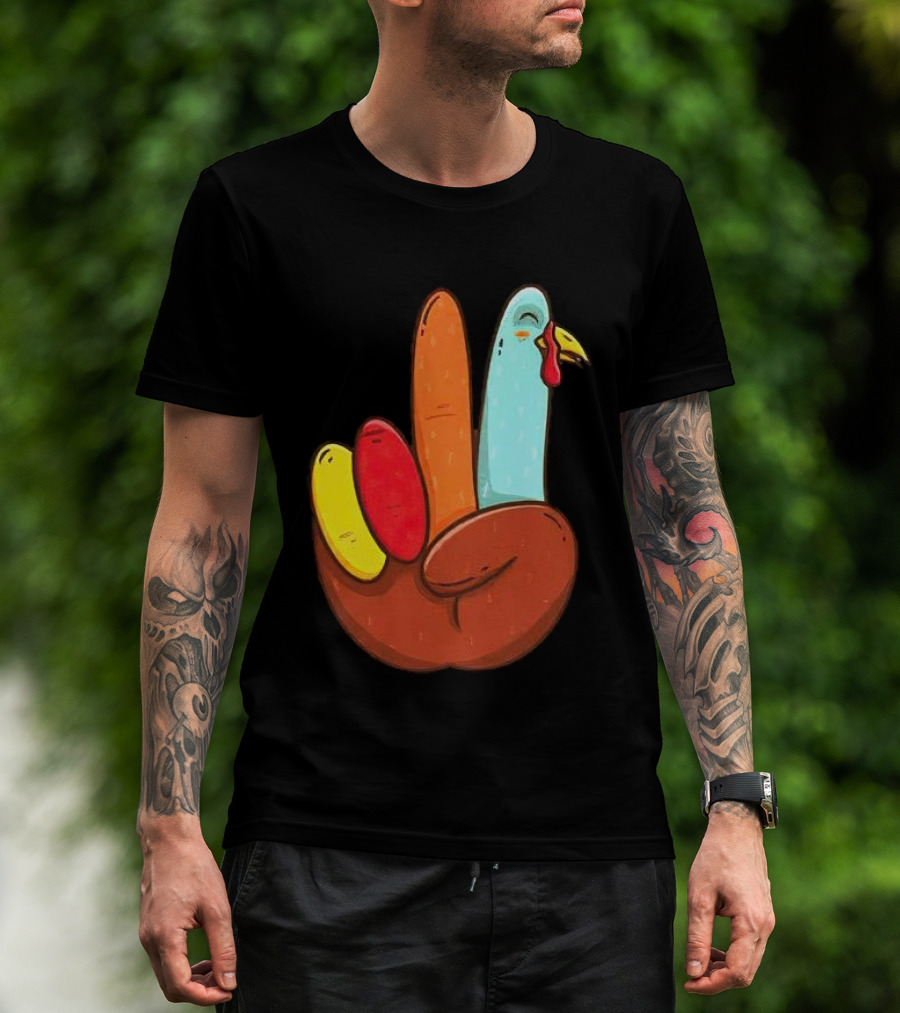 The Peace for Turkeys Hand Gesture Turkey Pardon Humor T-shirt is designed for everyday wear and a consistent fit. Fabric is pre-shrunk ring-spun cotton with durable stitching. See the size chart below for exact measurements.