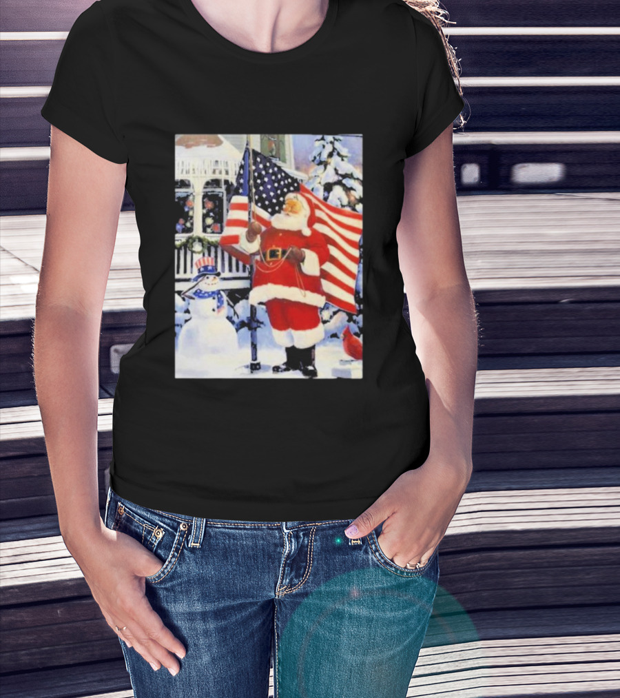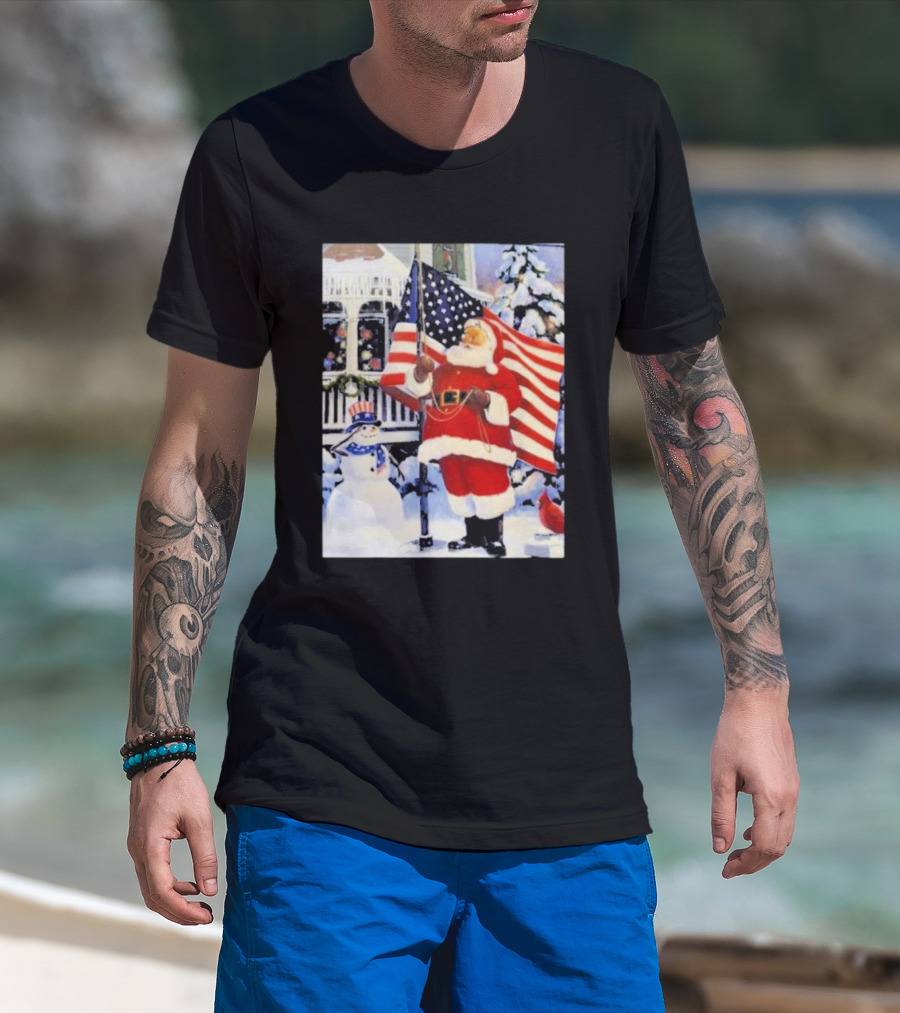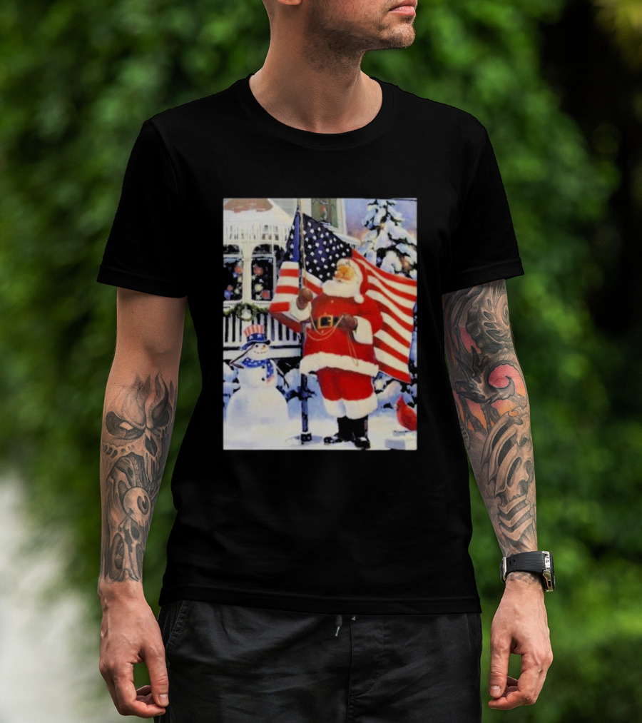 Santa Claus And Snowman With American Flag In Winter Scene T-Shirt