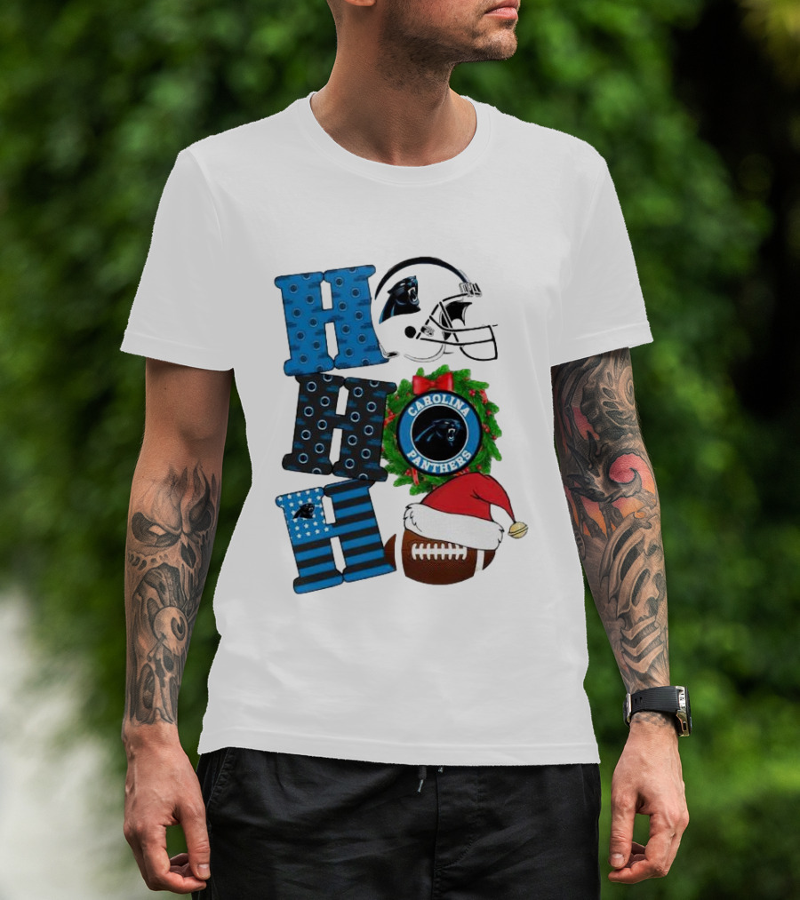 The Carolina Panthers Ho Ho Ho Merry Christmas Football Helmet Wreath Santa Hat T-shirt is designed for everyday wear and a consistent fit. Fabric is pre-shrunk ring-spun cotton with durable stitching. See the size chart below for exact measurements.