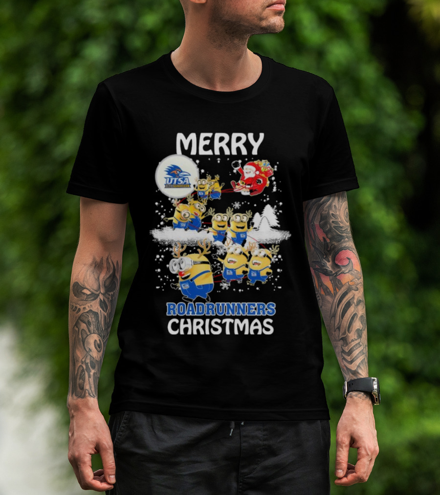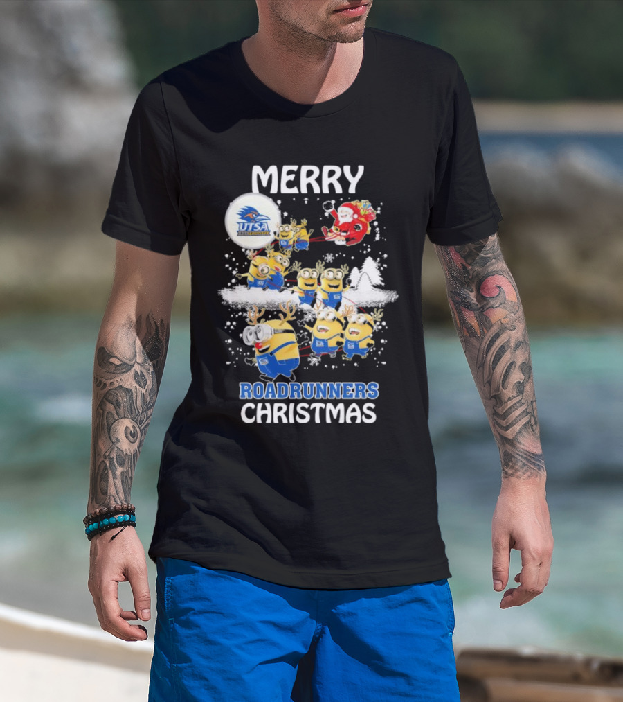 Merry UTSA Roadrunners Minions Christmas With Santa And Reindeer T-Shirt
