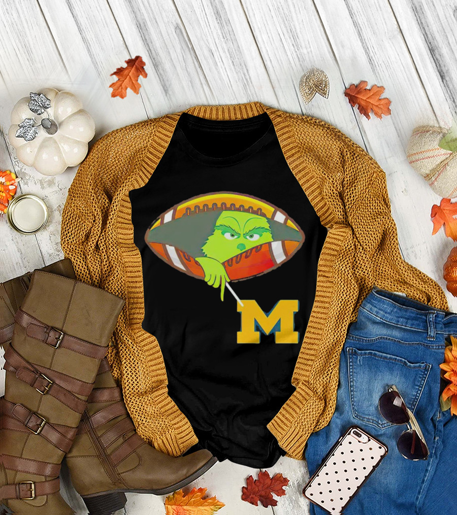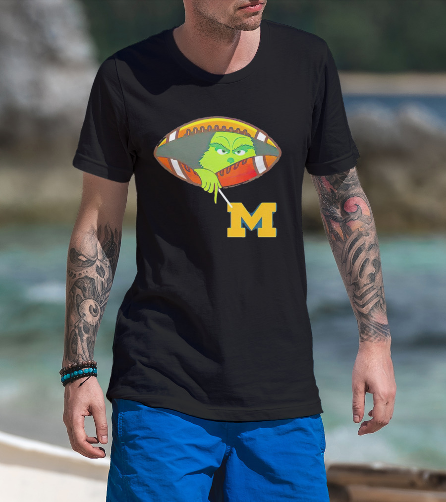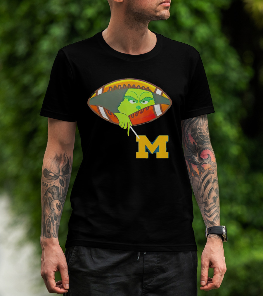 Grinch Peeking From Football Over Michigan Wolverines T-Shirt