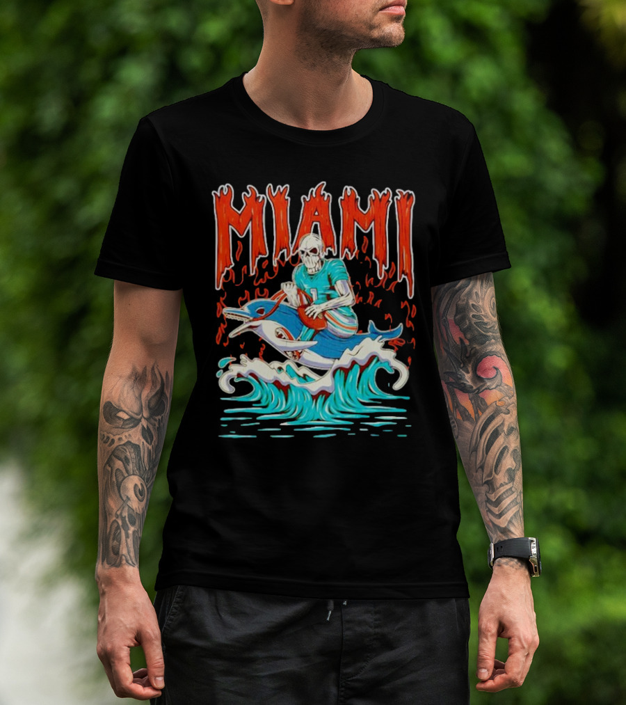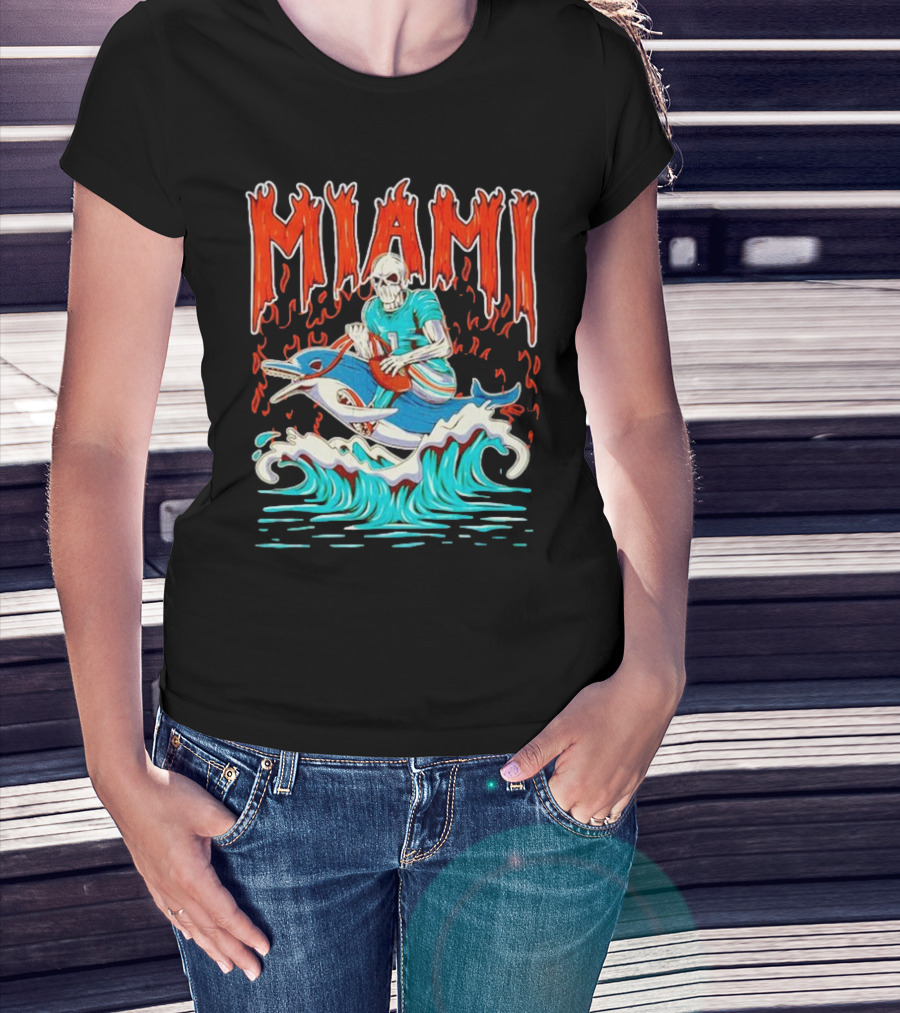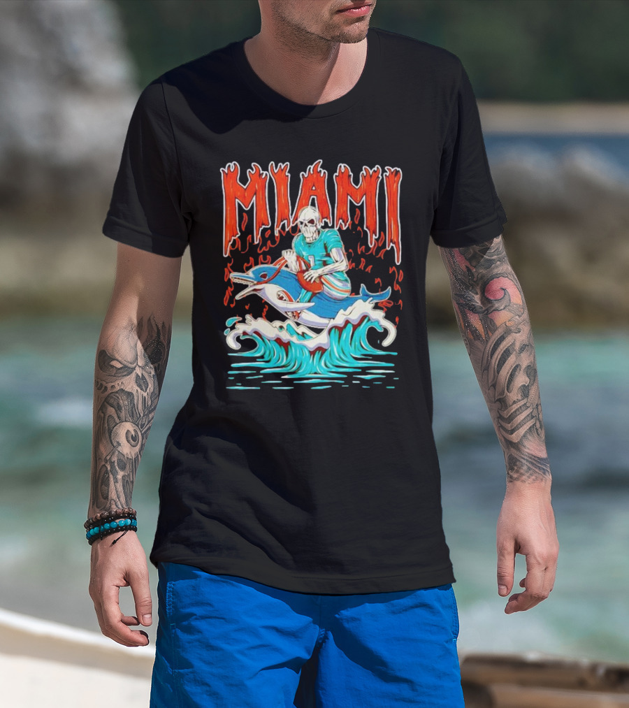 MIAMI Skeleton Riding Dolphin With Football And Flames T-Shirt