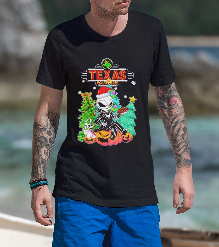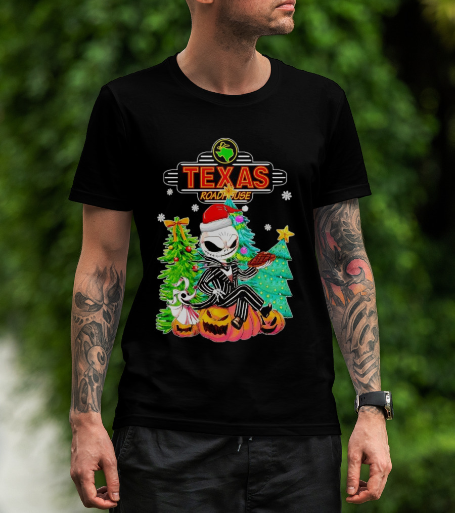 Jack Skellington Christmas With Texas Roadhouse Pumpkin And Christmas Trees T-Shirt