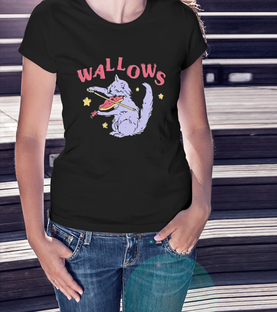 The Wallows Cat Playing Fiddle Surrounded by Stars T-shirt is designed for everyday wear and a consistent fit. Fabric is pre-shrunk ring-spun cotton with durable stitching. See the size chart below for exact measurements.