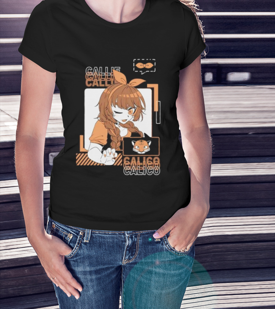 The Callie Calico Winking Girl with Cat Headband and Symbols T-shirt is designed for everyday wear and a consistent fit. Fabric is pre-shrunk ring-spun cotton with durable stitching. See the size chart below for exact measurements.