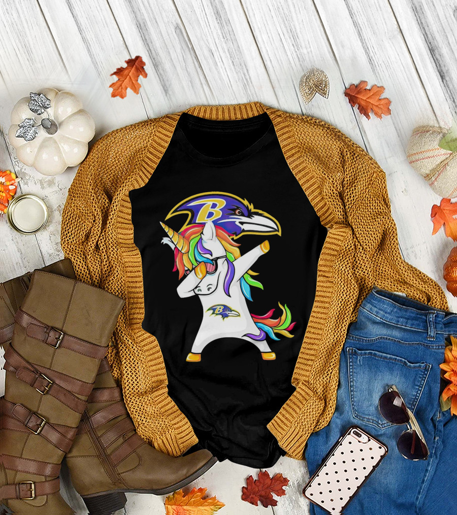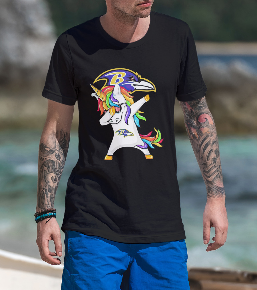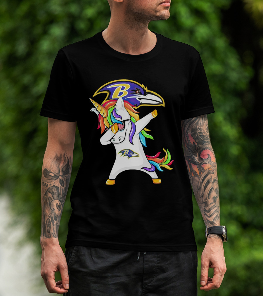 The Unicorn Dabbing Baltimore Ravens Emblem Rainbow Colors T-shirt is designed for everyday wear and a consistent fit. Fabric is pre-shrunk ring-spun cotton with durable stitching. See the size chart below for exact measurements.