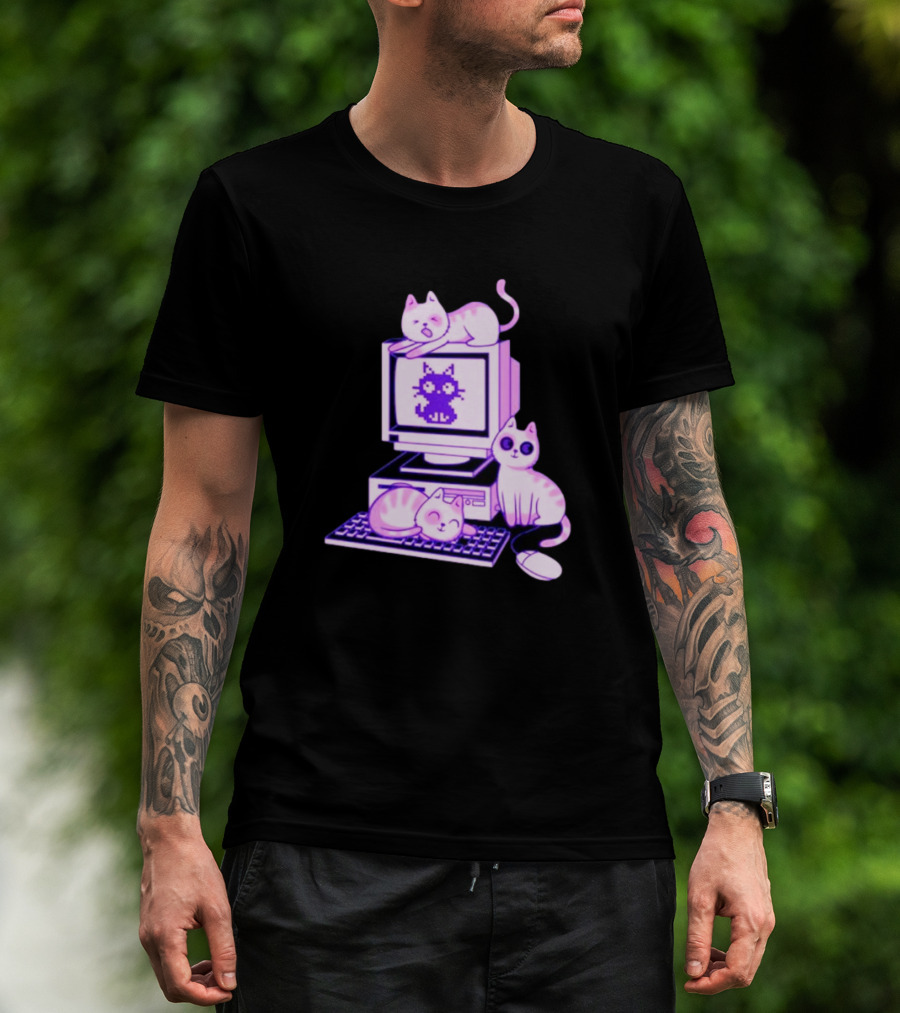 Cats Over Retro Computer With Pixel Art Cat On Screen T-Shirt