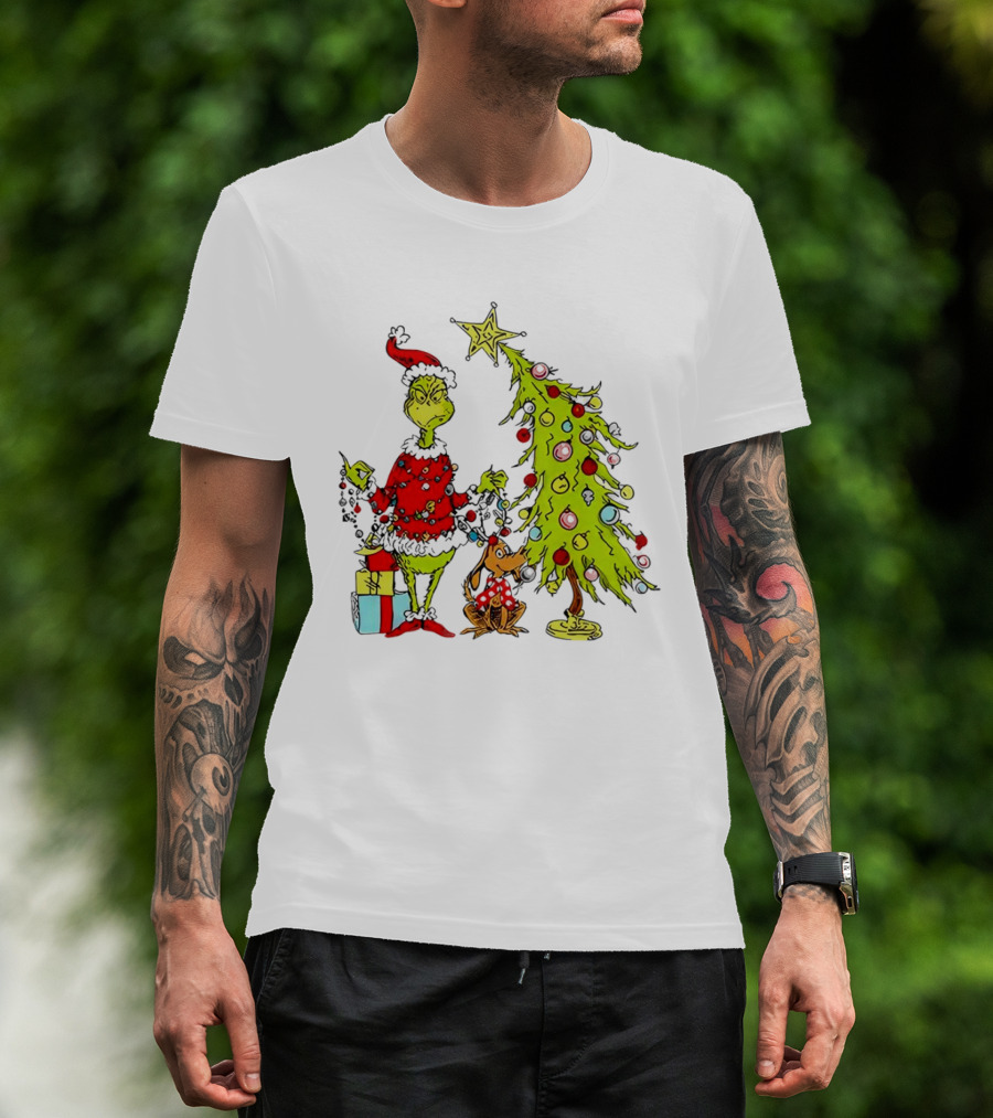 The Grinch in Santa Hat and Dog with Christmas Tree and Presents T-shirt is designed for everyday wear and a consistent fit. Fabric is pre-shrunk ring-spun cotton with durable stitching. See the size chart below for exact measurements.
