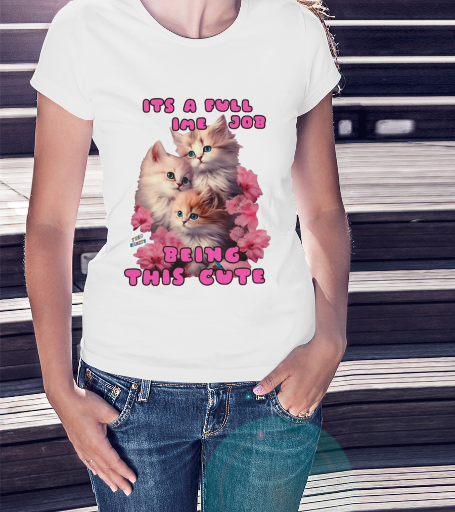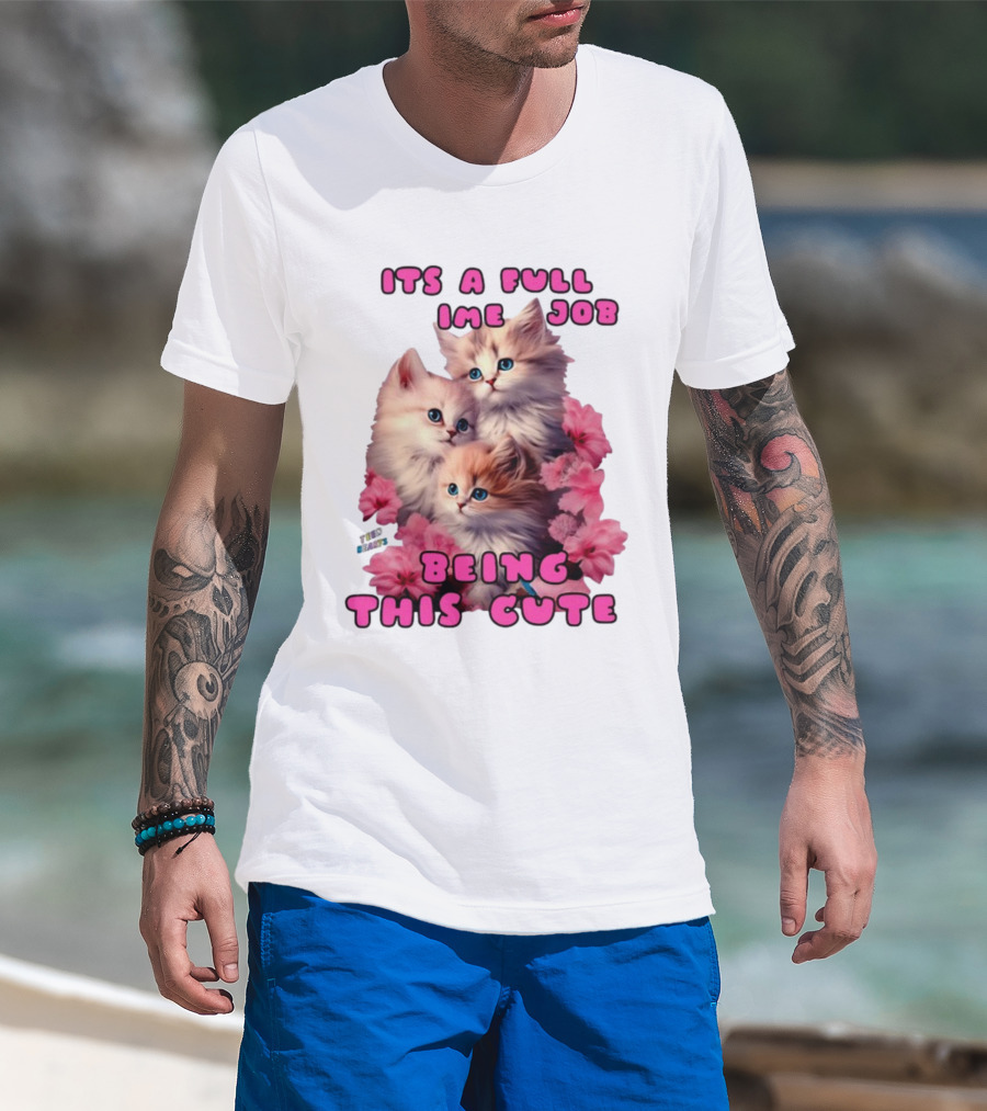 Its A Full Time Job Being This Cute Kittens Surrounded By Pink Flowers T-Shirt