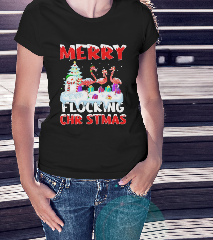 Merry Flocking Christmas Flamingo And Snowman Festive T-Shirt