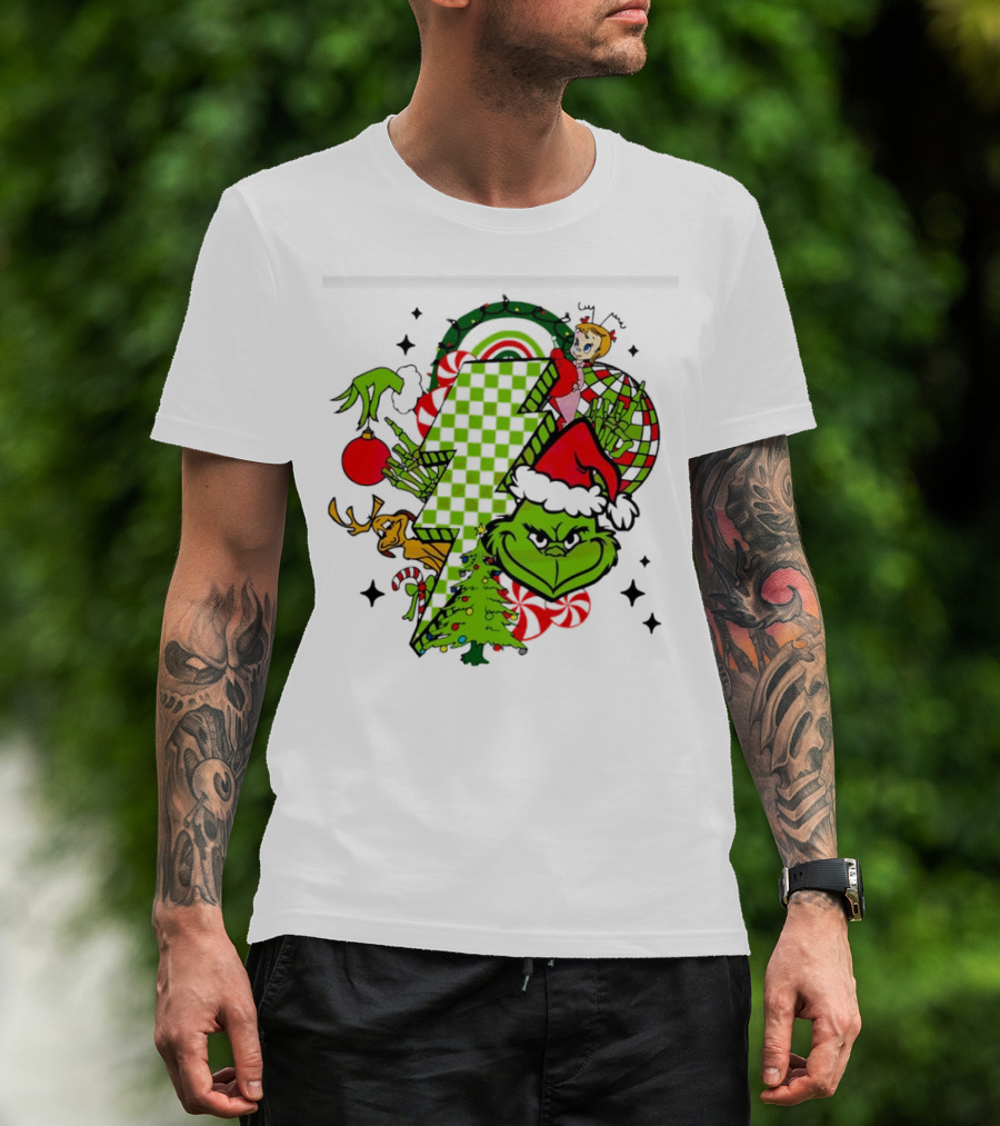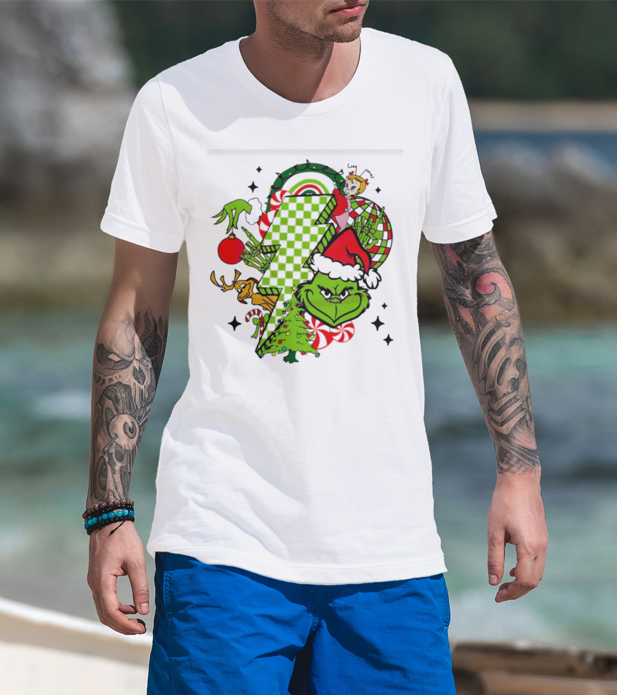 Grinch Christmas Checkered Lightning Bolt With Friends And Festive Decorations T-Shirt