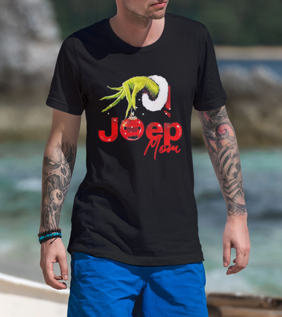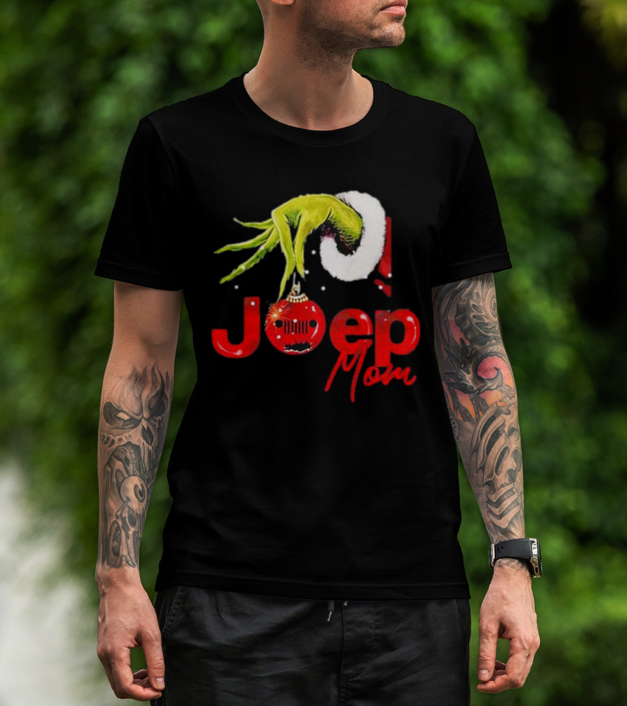 Grinch Hand With Santa Hat Holding Christmas Ornament Jeep Mom T-Shirt