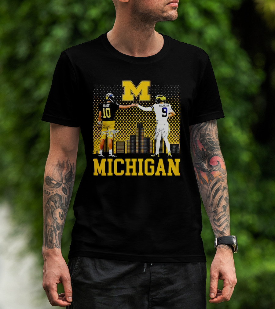 Michigan Wolverines Tom Brady Jj McCarthy Iconic Players Fist Bump Skyline T-Shirt